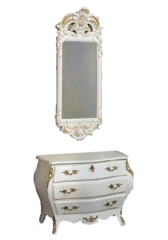 sisältää kaarevalinjaisen mahalipaston ja upean seinäpeilin, jotka tuovat eteiseen arvokkuutta ja käytännöllisyyttä. Saatavana useissa väreissä ja verhoiluissa, lisähinnasta myös käsin maalatulla kulta- tai harmaapatinoinnilla.