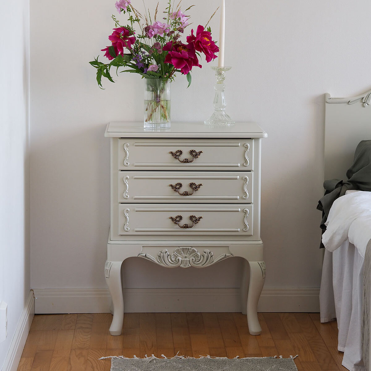 Sarjan kalusteet on valmistettu huolella kotimaisena käsityönä, mikä takaa korkean laadun ja kestävyyden. Saatavilla useissa väreissä ja verhoiluissa, ja lisähinnasta ryhmän voi viimeistellä käsin maalatulla kullan- tai harmaanvärisellä patinoinnilla, joka korostaa sen yksityiskohtia.