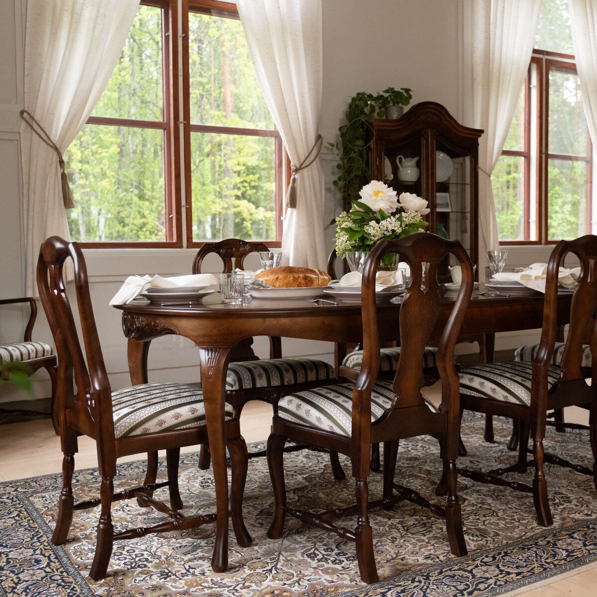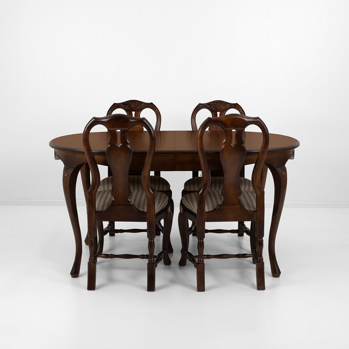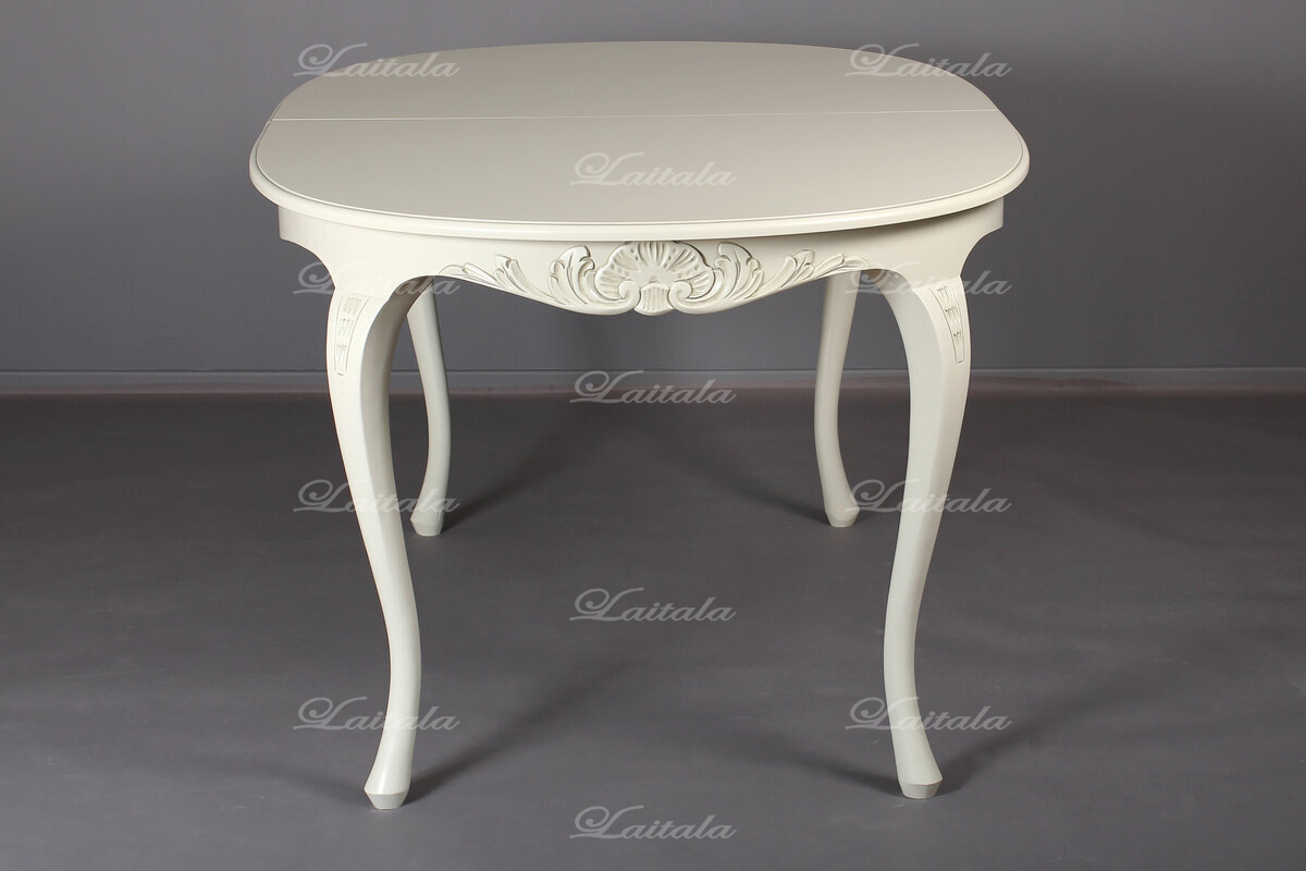 Tämä upea ruokailuryhmä koostuu ovaalin mallisesta jatkettavasta pöydästä kahdella jatkopalalla sekä neljästä Mozart-kankaalla verhoillusta tuolista, jotka tuovat tilaan eleganttia tunnelmaa. Lisätuolit ovat helposti tilattavissa erikseen, ja halutessasi voit tilata tuolit verhoiltuna myös muilla kankailla.