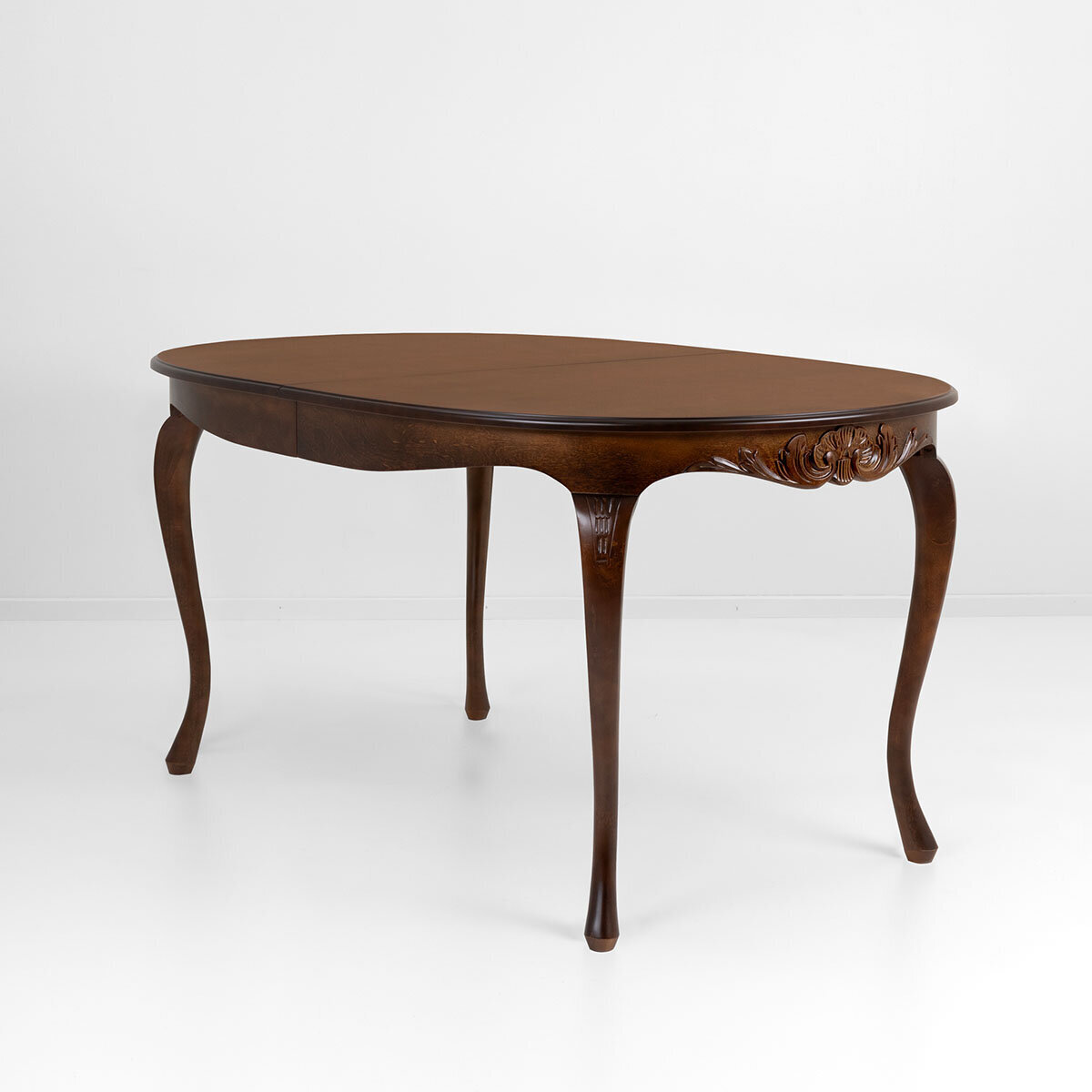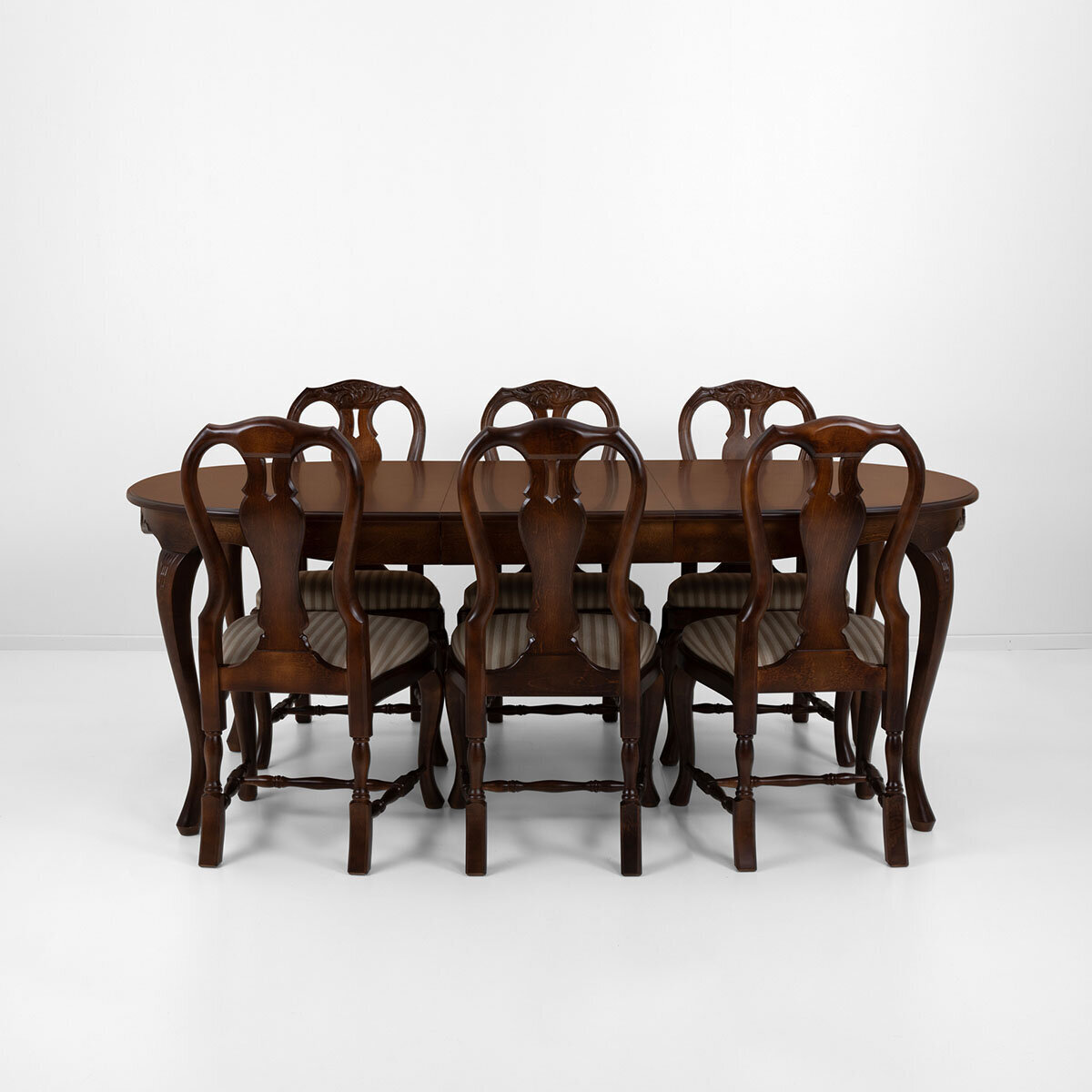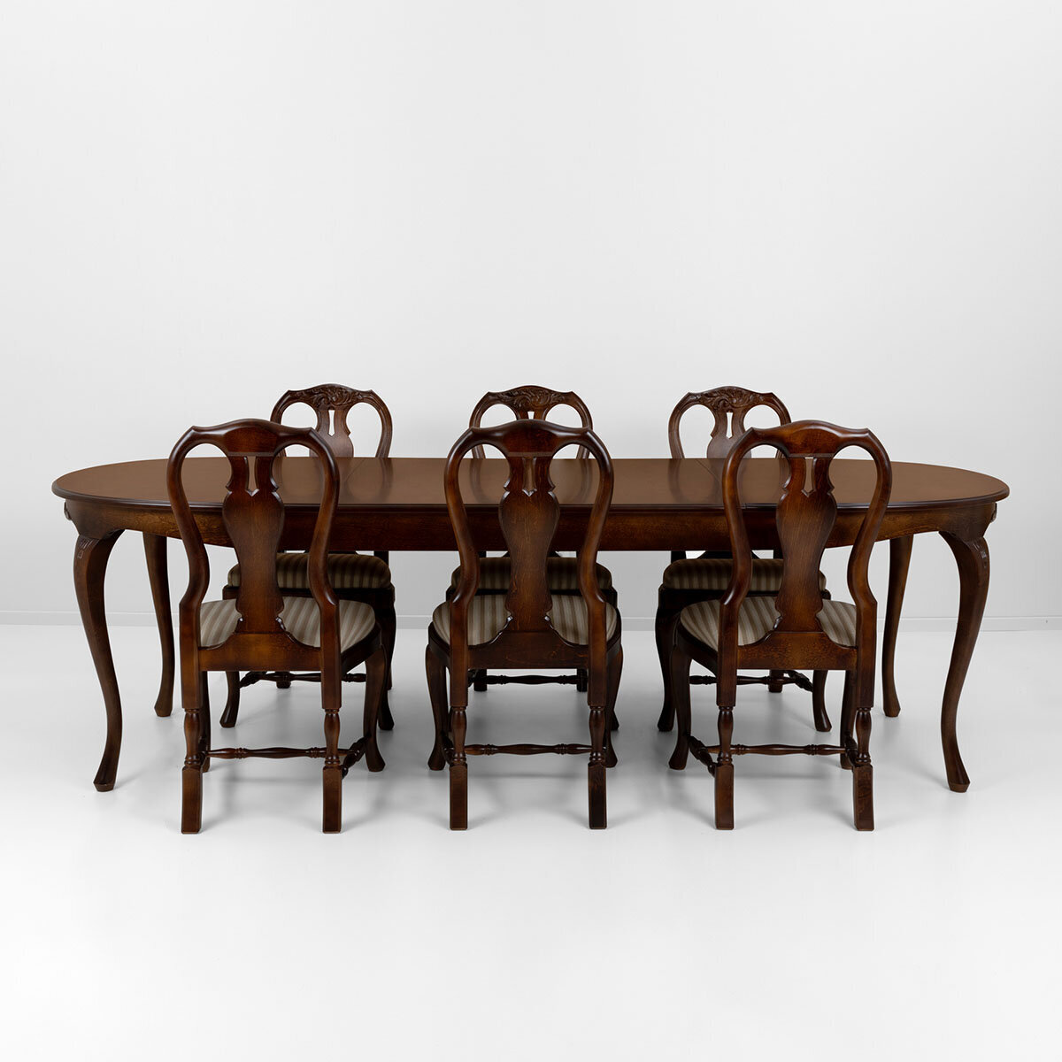 Tämä upea ruokailuryhmä koostuu ovaalin mallisesta jatkettavasta pöydästä kahdella jatkopalalla sekä neljästä Mozart-kankaalla verhoillusta tuolista, jotka tuovat tilaan eleganttia tunnelmaa. Lisätuolit ovat helposti tilattavissa erikseen, ja halutessasi voit tilata tuolit verhoiltuna myös muilla kankailla.