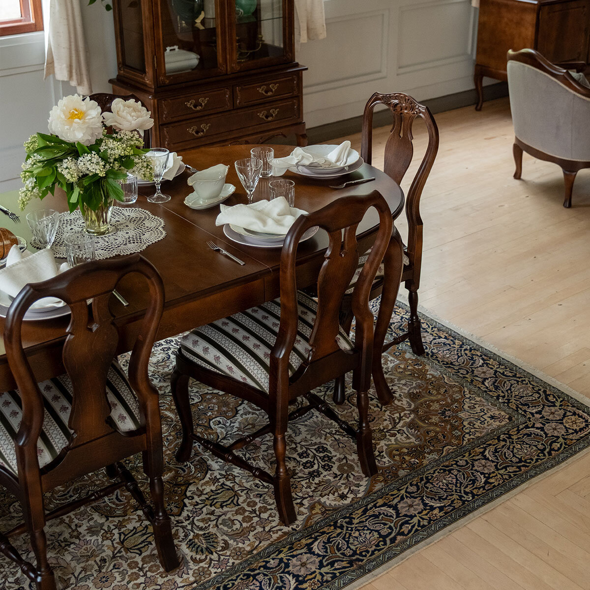 Yhdistä tuolit talonpoikaisrokokoo ruokapöytään tai käytä yksittäisenä istuimena ja koristeellisena sisustuselementtinä. Tuoli soveltuu pariksi myös talonpoikaisrokokoo kirjoituspöydän tai muun työpöydän kanssa. Voit käyttää tuolia pukeutumistuolina makuuhuoneessa tai walk-in-vaatehuoneessa. Mikäli etsit tuolista käsinojallista versiota, tutustu saman sarjan Talonpoikaisrokokoo nojatuoliin. Selkänojan koristekuvio on rokokookalusteille tyypillisesti hieman epäsymmetrinen. Koristeaiheena on simpukkaa muistuttavaa rocaille-kuvio, tuttavallisemmin näkinkenkä. Kuviota ympäröivät lehtiornamentit. Istuinosassa koristekuvio on symmetrinen.Kotimainen käsityö ja tarkka viimeistely takaavat kalusteiden erinomaisen laadun ja ajattoman tyylin. Ruokailuryhmä on saatavana useissa väreissä ja verhoiluissa, ja siihen voidaan lisätä käsin maalattu kulta- tai harmaapatinointi. Tuotteet toimitetaan valmiiksi koottuina – käyttövalmiina heti kotiisi.