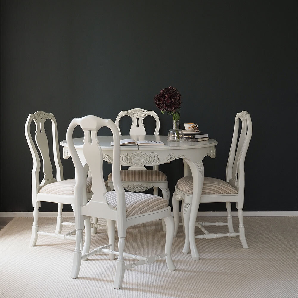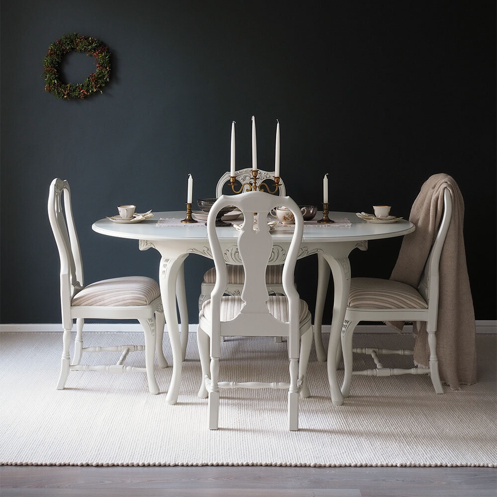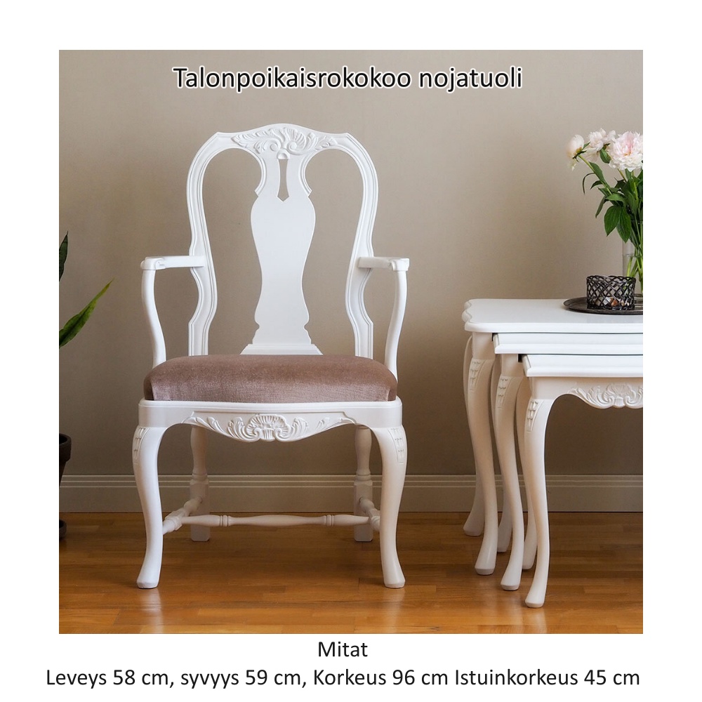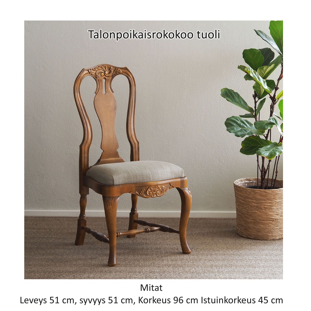 Yhdistä tuolit talonpoikaisrokokoo ruokapöytään tai käytä yksittäisenä istuimena ja koristeellisena sisustuselementtinä. Tuoli soveltuu pariksi myös talonpoikaisrokokoo kirjoituspöydän tai muun työpöydän kanssa. Voit käyttää tuolia pukeutumistuolina makuuhuoneessa tai walk-in-vaatehuoneessa. Mikäli etsit tuolista käsinojallista versiota, tutustu saman sarjan Talonpoikaisrokokoo nojatuoliin. Selkänojan koristekuvio on rokokookalusteille tyypillisesti hieman epäsymmetrinen. Koristeaiheena on simpukkaa muistuttavaa rocaille-kuvio, tuttavallisemmin näkinkenkä. Kuviota ympäröivät lehtiornamentit. Istuinosassa koristekuvio on symmetrinen.Kotimainen käsityö ja tarkka viimeistely takaavat kalusteiden erinomaisen laadun ja ajattoman tyylin. Ruokailuryhmä on saatavana useissa väreissä ja verhoiluissa, ja siihen voidaan lisätä käsin maalattu kulta- tai harmaapatinointi. Tuotteet toimitetaan valmiiksi koottuina – käyttövalmiina heti kotiisi.