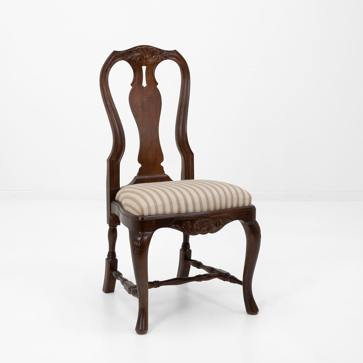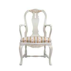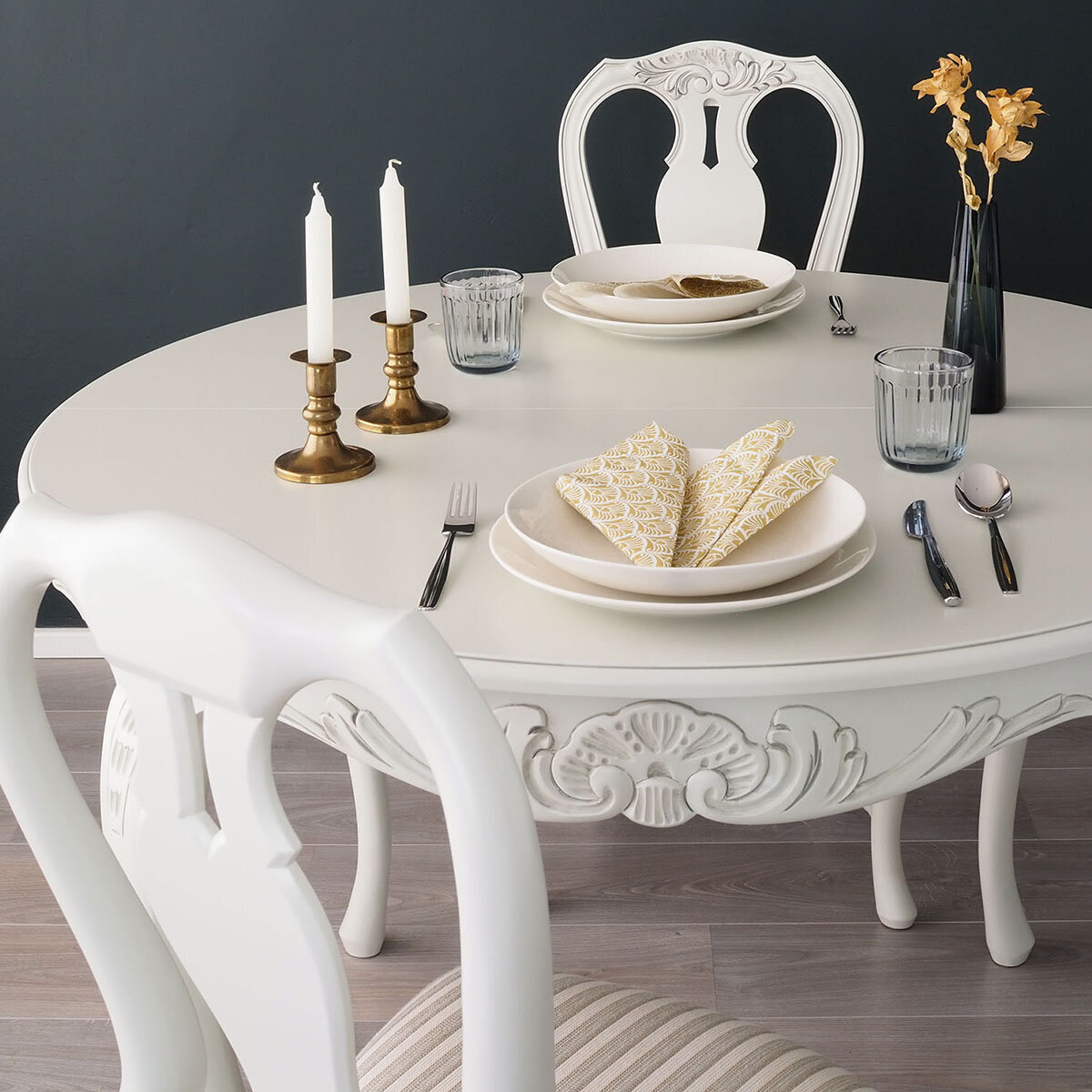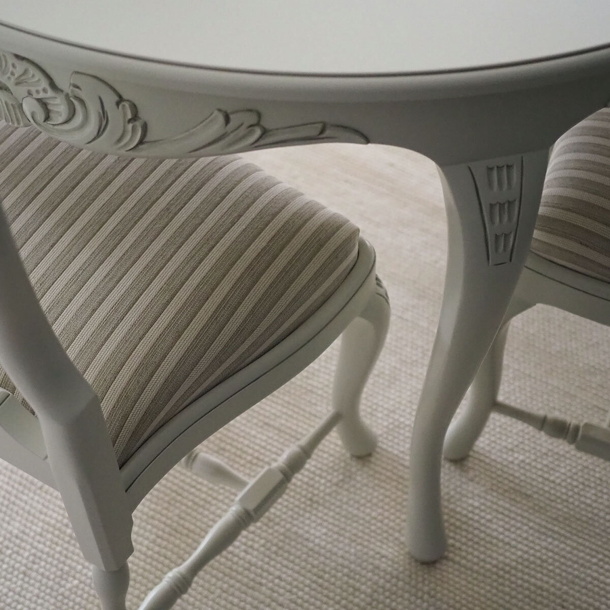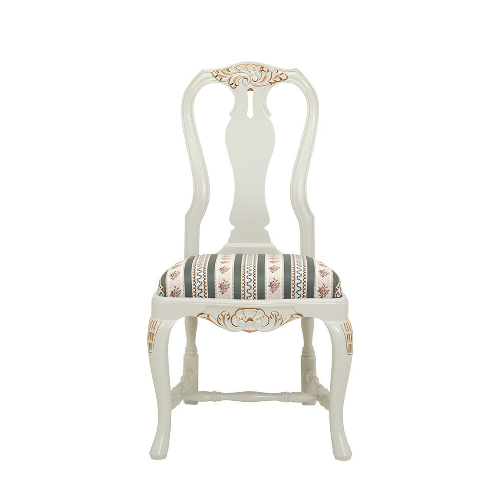 Yhdistä tuolit talonpoikaisrokokoo ruokapöytään tai käytä yksittäisenä istuimena ja koristeellisena sisustuselementtinä. Tuoli soveltuu pariksi myös talonpoikaisrokokoo kirjoituspöydän tai muun työpöydän kanssa. Voit käyttää tuolia pukeutumistuolina makuuhuoneessa tai walk-in-vaatehuoneessa. Mikäli etsit tuolista käsinojallista versiota, tutustu saman sarjan Talonpoikaisrokokoo nojatuoliin. Selkänojan koristekuvio on rokokookalusteille tyypillisesti hieman epäsymmetrinen. Koristeaiheena on simpukkaa muistuttavaa rocaille-kuvio, tuttavallisemmin näkinkenkä. Kuviota ympäröivät lehtiornamentit. Istuinosassa koristekuvio on symmetrinen.Kotimainen käsityö ja tarkka viimeistely takaavat kalusteiden erinomaisen laadun ja ajattoman tyylin. Ruokailuryhmä on saatavana useissa väreissä ja verhoiluissa, ja siihen voidaan lisätä käsin maalattu kulta- tai harmaapatinointi. Tuotteet toimitetaan valmiiksi koottuina – käyttövalmiina heti kotiisi.