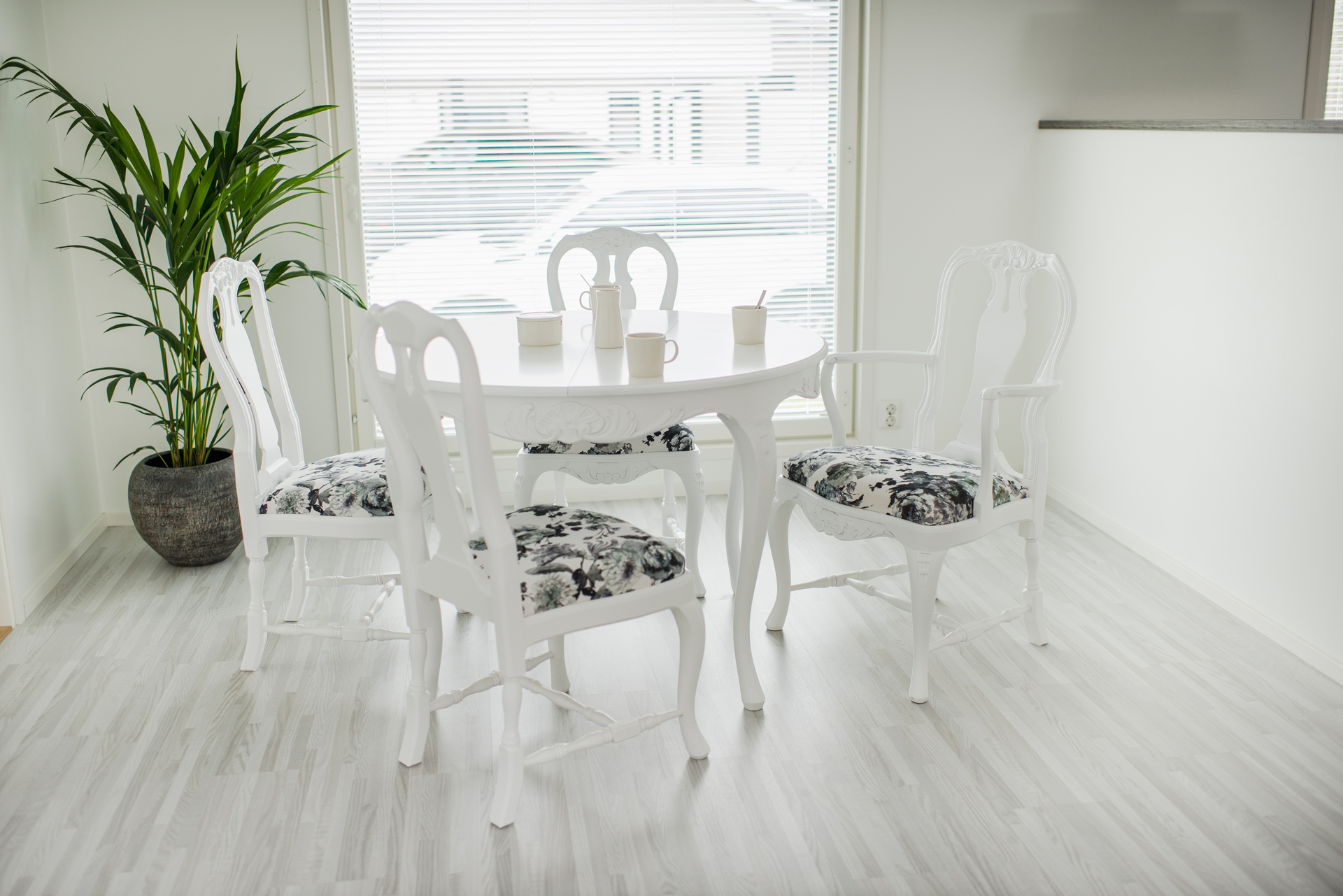 Tämä ruokailuryhmä sisältää pyöreän jatkettavan pöydän yhdellä jatkopalalla sekä neljä tuolia, saatavan usealla eri verhoilulla. Lisätuolit ovat helposti tilattavissa, ja halutessasi tuolit voidaan verhoilla myös muilla kankailla