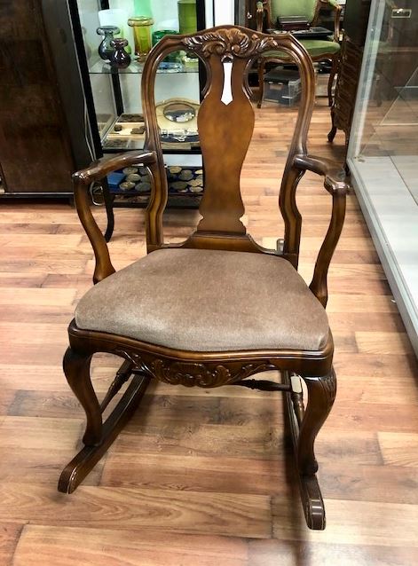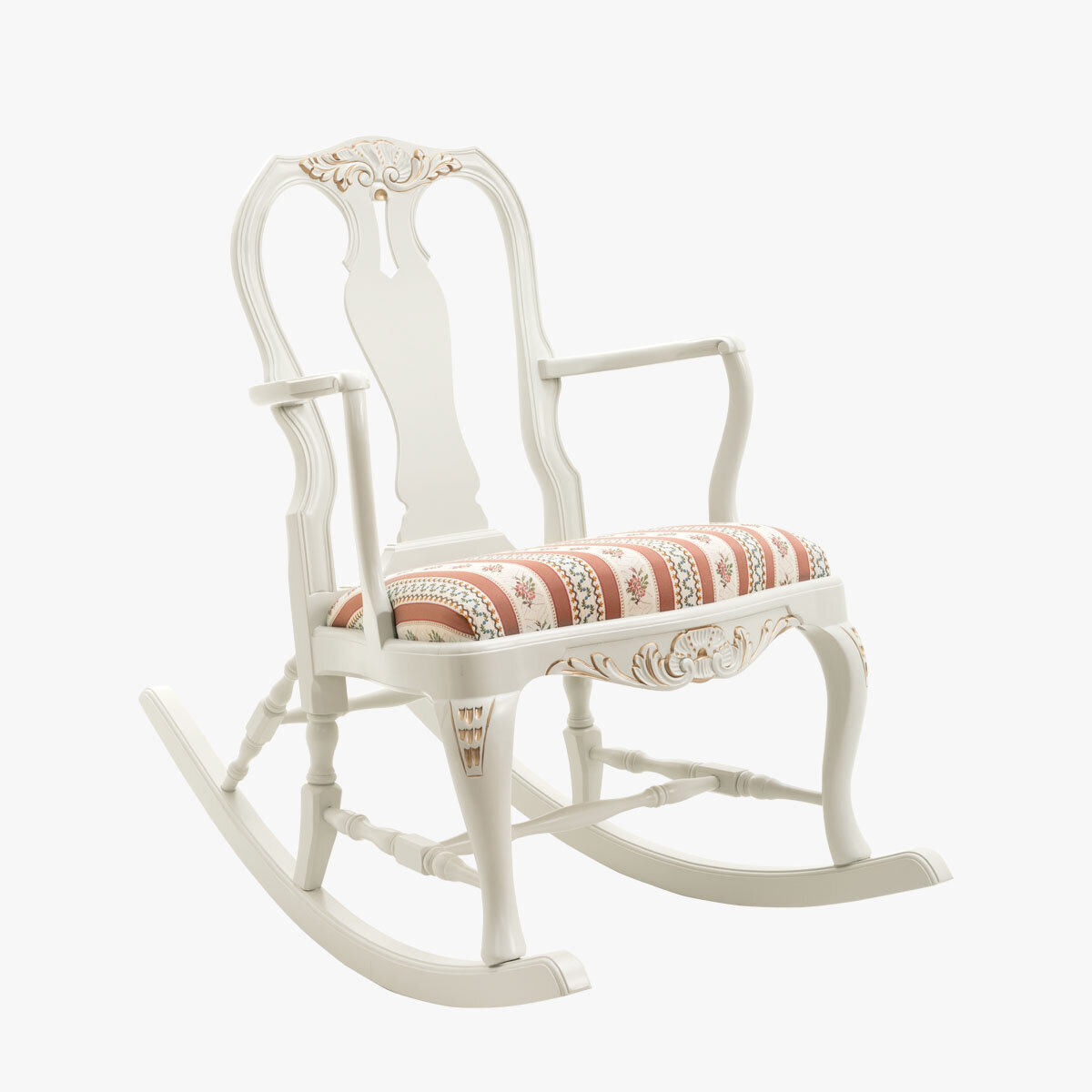 Talonpoikaisrokokoo keinutuoli on ajaton klassikko, joka yhdistää käsin veistetyt yksityiskohdat ja rokokootyylille tunnusomaiset muodot rauhoittavaan keinuntaan. Keinutuolin pehmustettu istuinosa on joustinvyöllä toteutettu ja irrotettava, joten se on paitsi mukava myös helppo verhoilla uudelleen.