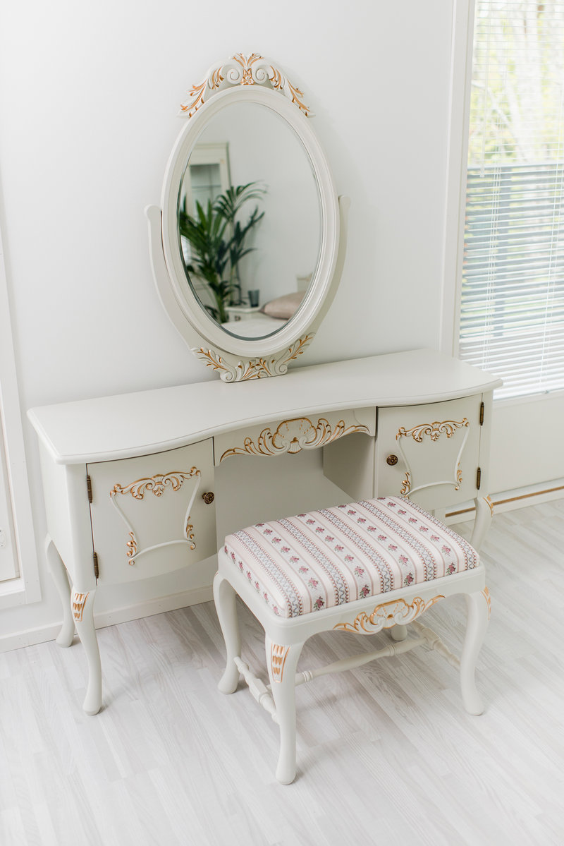 Säilytystilaa löytyy kahdesta pienestä kaapista ja yhdestä matalasta laatikosta, ja pöytätasolla on tilaa tärkeimmille tarvikkeille tai kauneimmille esineille. Kokonaisuus täydentyy kauniisti erikseen tilattavalla Talonpoikaisrokokoo-rahilla tai muulla jakkaralla.
