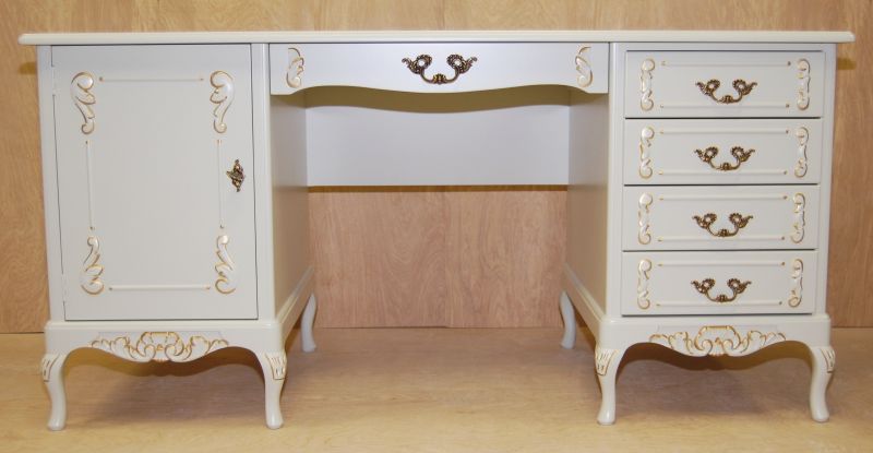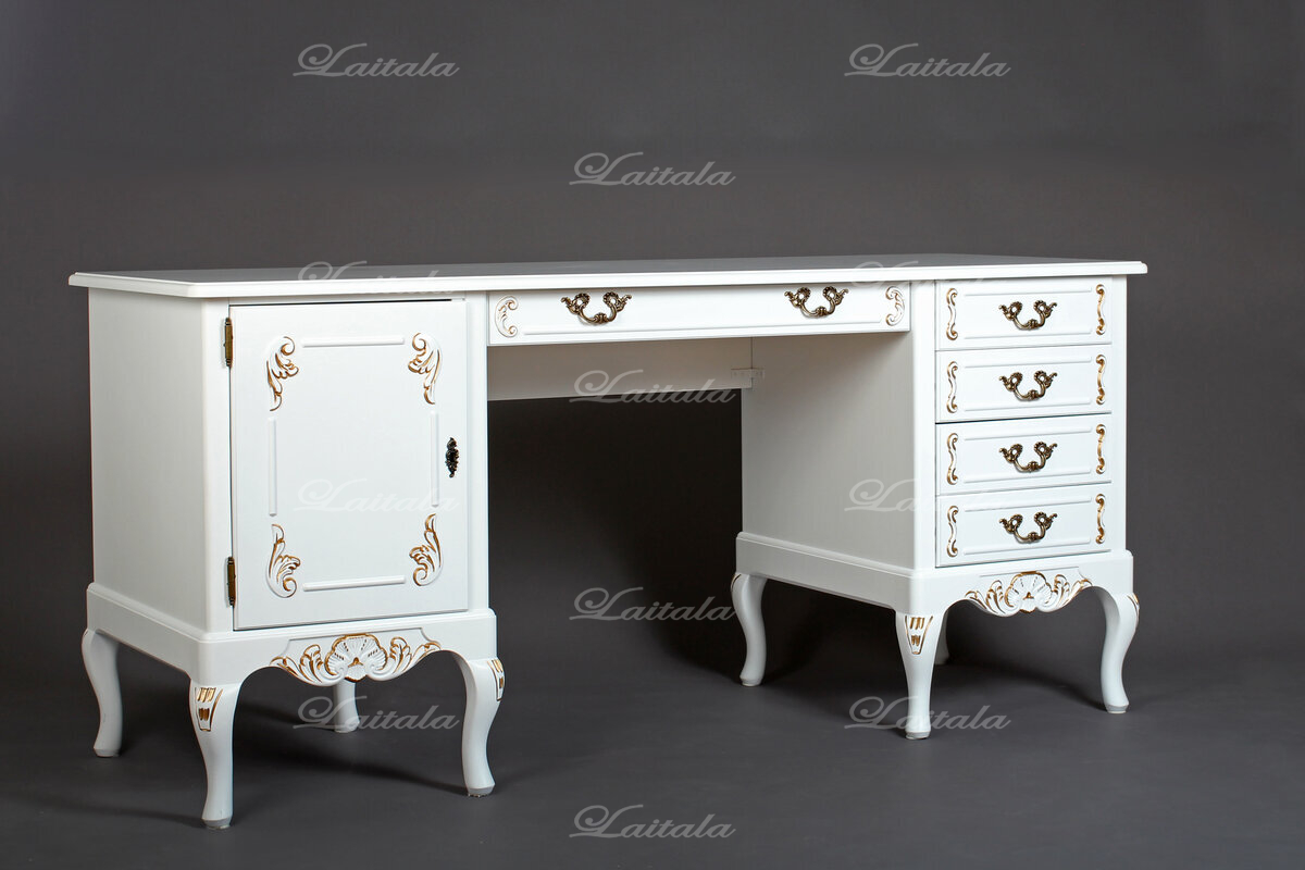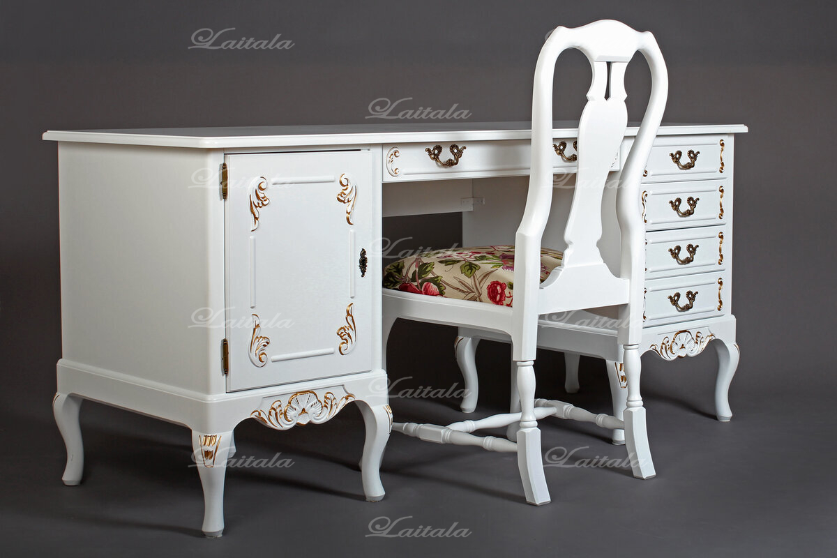 Pöydässä on monipuolisesti säilytystilaa: vasemmalla puolella kaappi siirrettävällä hyllylevyllä, oikealla neljä laatikkoa ja keskellä työtason alla yksi leveämpi laatikko. Tilaa toimistotarvikkeille ja tärkeimmille papereille löytyy siis runsaasti. Kokonaisuuden täydentää kauniisti saman sarjan Talonpoikaisrokokoo-tuoli, joka sopii täydellisesti pöydän alle ja on tilattavissa sivuiltamme.