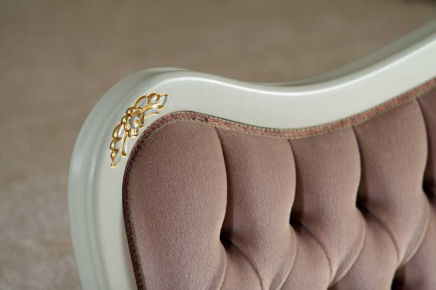 Tämä upea Talonpoikaisrokokoo-sänky on verhoiltu kankaalla, joka tuo siihen pehmeyttä ja ylellisyyttä. Pääpääty on verhoiltu yhdeltä puolelta ja jalkapääty molemmilta puolilta, mikä korostaa sängyn viimeisteltyä ulkonäköä. Pyöristetyt muodot, kaarevat jalat ja käsin veistetyt lehtiornamentit sekä simpukkaa muistuttava rocaille-kuvio tekevät siitä ajattoman katseenvangitsijan.