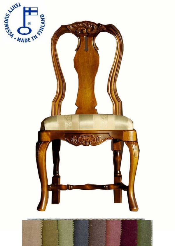 • Kotimainen talonpoikaisrokokoo Tuoli verhoiltuna samettimaisella Opera kankaalla. Saatavana myös muilla kankailla verhoiltuna ota yhteyttä asiakaspalveluunKotimaiset Talonpoikaisrokokoo kalusteet ovat laadultansa erinomaisia tyylikalusteita ja ne on viimeistelty käsityönä. Sarjan tuotteita on saatavana useilla erä väreillä ja verhoiluilla. Tuotteisiin on myös saatavana lisähinnasta kullan tai harmaan värinen patinointi, joka maalataan käsin tuotteeseen. Tuotteet toimitetaan koottuina.