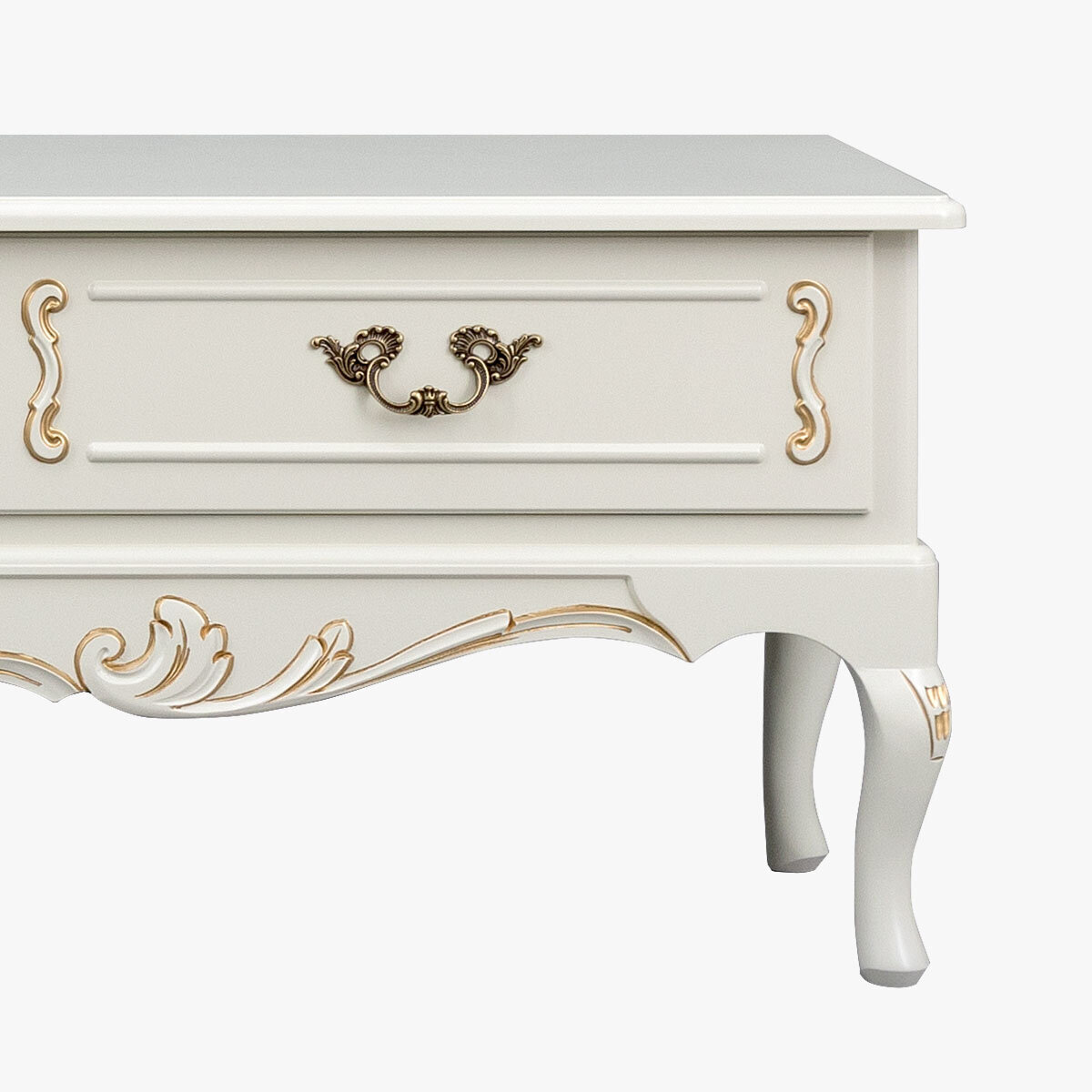 Tv-tasoa koristavat käsin veistetyt yksityiskohdat, kaarevat jalat sekä messinginväriset, antiikkipatinoidut helat, jotka tuovat rokokootyylin arvokkuuden esiin. Saatavana useissa eri väreissä ja verhoiluissa, ja lisäeleganssia kalusteeseen saa käsin maalatulla kullan- tai harmaanvärisellä patinoinnilla.