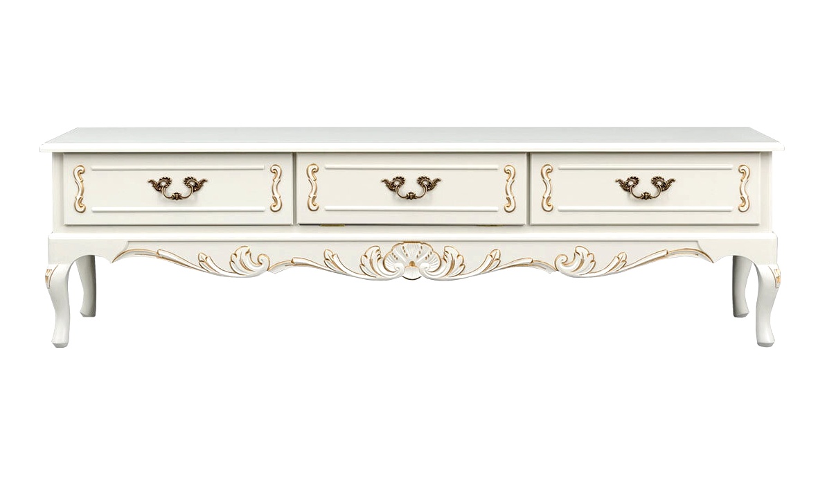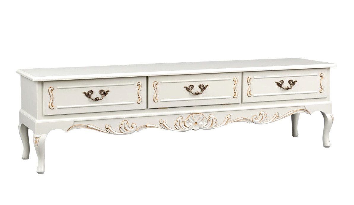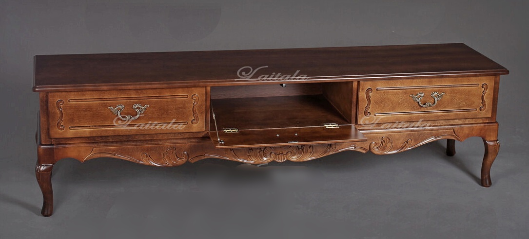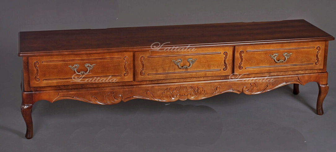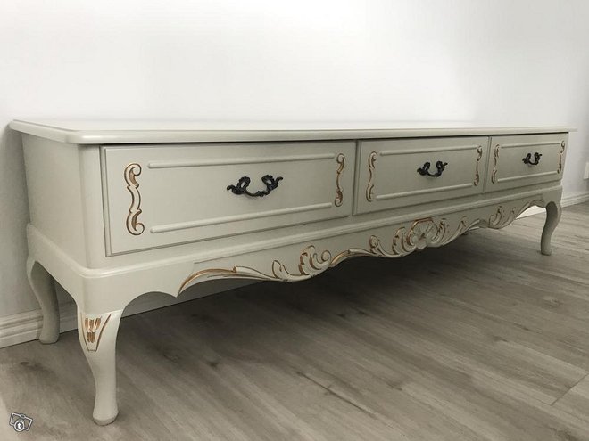 Kotimainen Talonpoikaisrokokoo tv-taso kolmella laatikolla – perinteinen eleganssi kohtaa modernin käytännöllisyyden