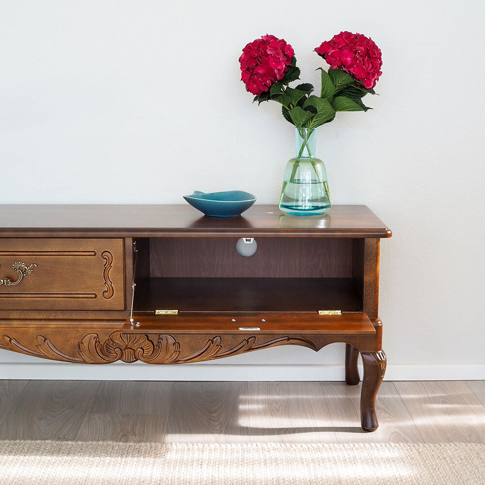 Tämä kotimainen Talonpoikaisrokokoo-tv-taso yhdistää klassisen rokokootyylin ja modernit tarpeet. Tasossa on vasemmalla laatikko ja oikealla alaspäin avautuva klaffiovi, jonka takana on kätevä johtoläpivienti – vaihtoehtoisesti voit tilata tason kahdella laatikolla.