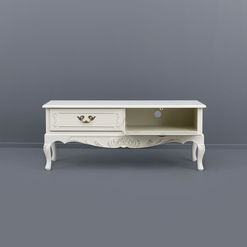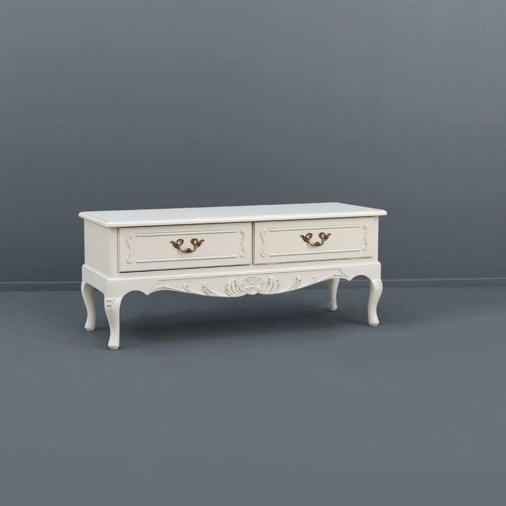 Kaarevat jalat, käsin veistetyt yksityiskohdat sekä messinginväriset, antiikkipatinoidut helat tekevät tästä tv-tasosta arvokkaan katseenvangitsijan. Saatavana useissa eri väreissä, ja lisäeleganssia siihen tuo käsin maalattu kullan- tai harmaanvärinen patinointi.