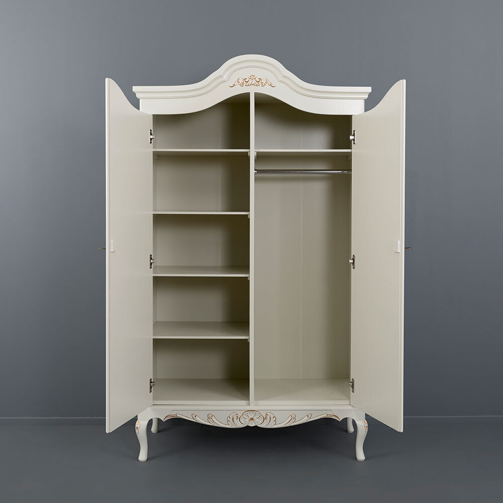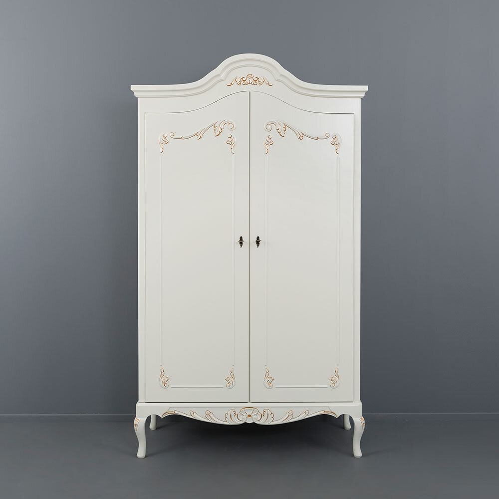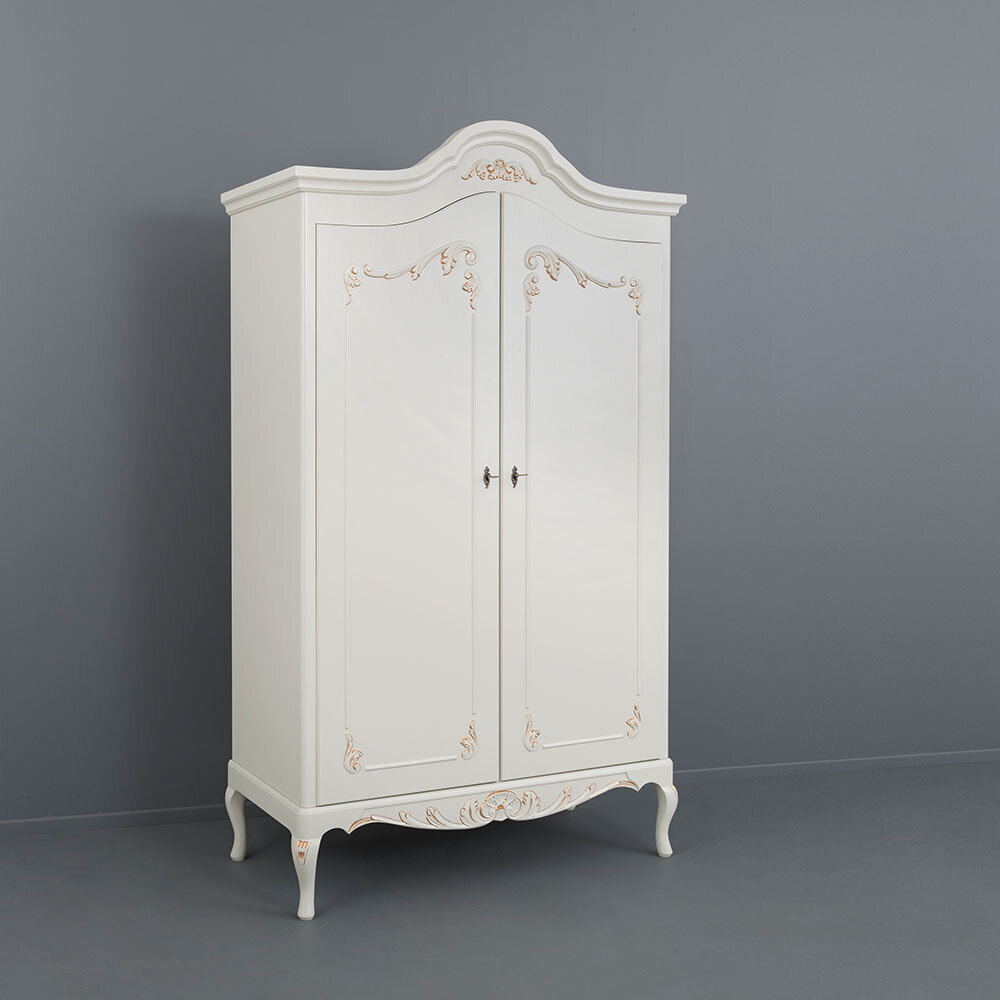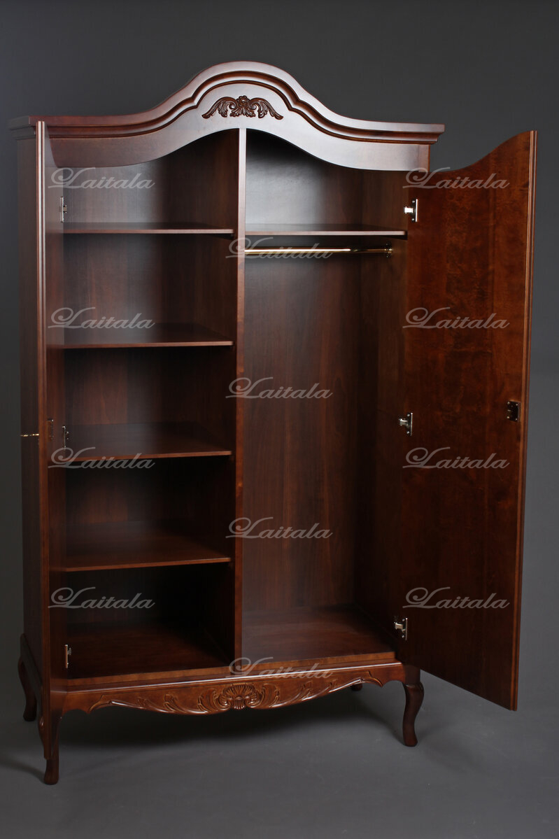 tarjoaa runsaasti säilytystilaa hyllyillä, hattuhyllyllä ja messinginvärisellä vaatetangolla. Kauniit käsin veistetyt yksityiskohdat, antiikkipatinoidut messinkihelat ja mahdollisuus kulta- tai harmaapatinointiin viimeistelevät laadukkaan kotimaisen käsityön – toimitetaan valmiiksi koottuna.