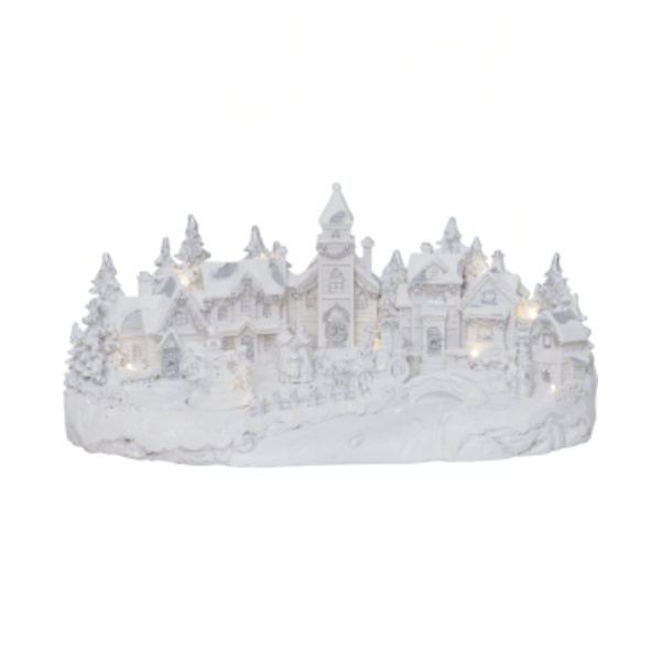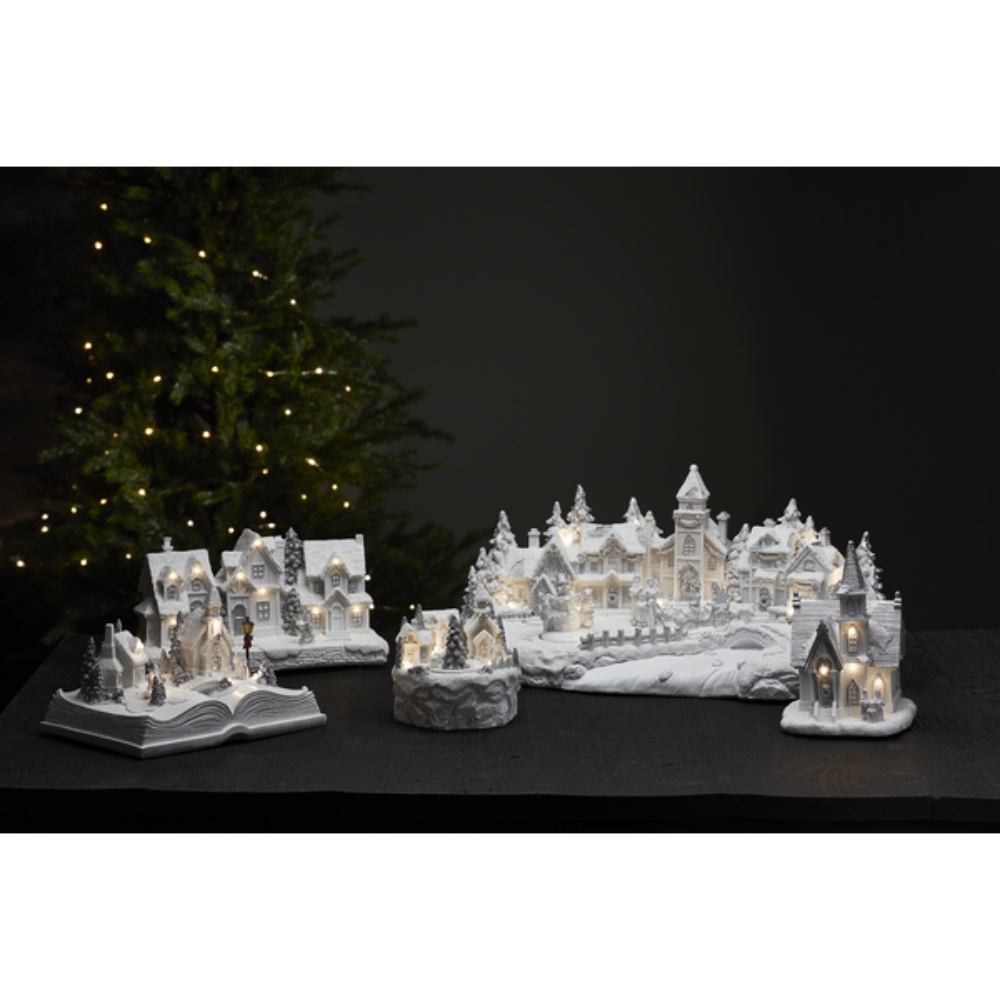Hieno valkoinen koristekylä, jossa upeita erilaisia yksityiskohtia. Kylässä on 3 liikkuvaa elementtiä ja se soittaa 8 eri joululaulua. Valojen sävyt ovat lämpimän valkoisia. Koriste on tarkoitettu sisäkäyttöön.