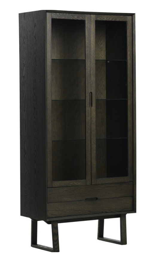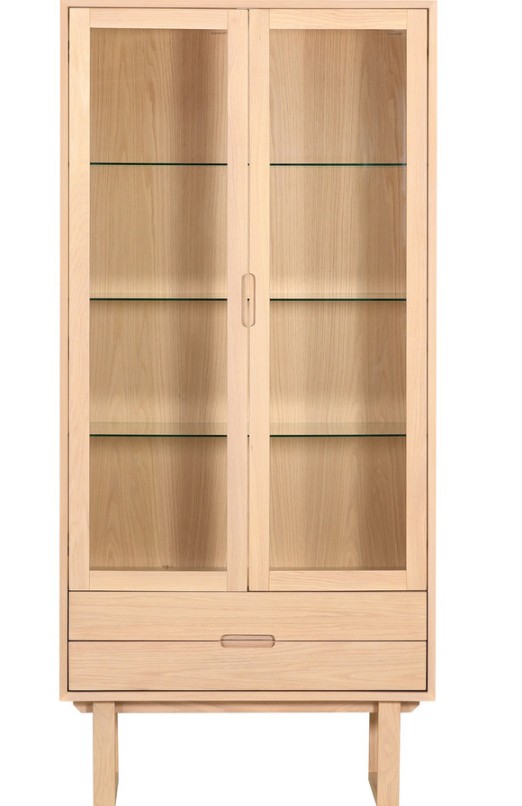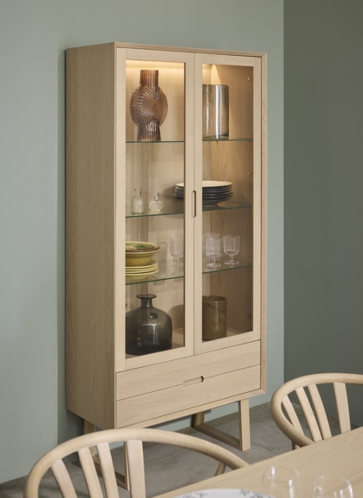 Vitriinin alaosassa olevat kaksi vetolaatikkoa tuovat lisää käytännöllisyyttä ja mahdollistavat pientavaroiden huomaamattoman säilytyksen. Kauniit uritetut vetimet ja korkeat jalat viimeistelevät modernin skandinaavisen muotoilun, joka sopii saumattomasti Tanum-sarjan muihin kalusteisiin.