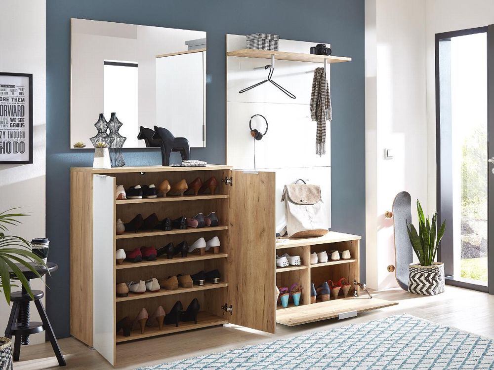 Telde kenkäkaappi 3937 tarjoaa runsaasti tilaa jopa 20 kenkäparille kolmen kaapin ja neljän korkeussäädettävän hyllyn ansiosta, jolloin kengät pysyvät siististi järjestyksessä. Sen selkeä ja toimiva rakenne tekee eteisen arjen järjestämisestä helpompaa ja sujuvampaa.