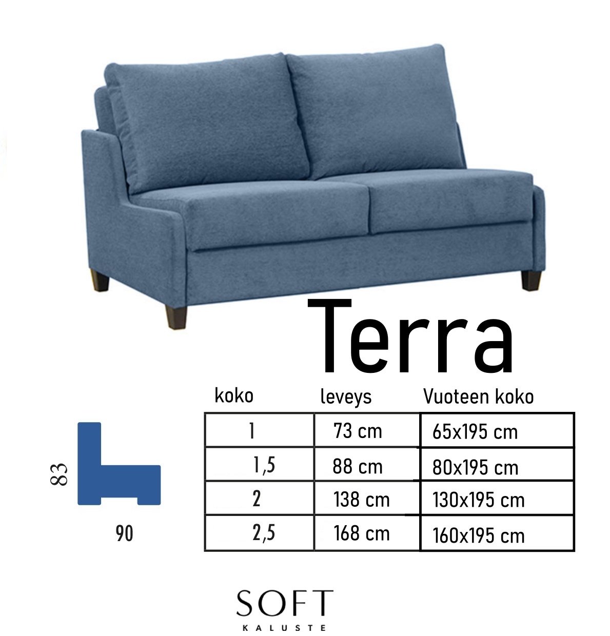 Sohva toimitetaan lähes täysin koottuna, joten sinun tarvitsee vain kiinnittää jalat ja asetella selkänojatyynyt paikoilleen. Käytännöllinen mekanismi, ajaton design ja kotimainen valmistus tekevät Terra 2,5-istuttavasta vuodesohvasta pitkäikäisen ja tyylikkään valinnan mihin tahansa kotiin.