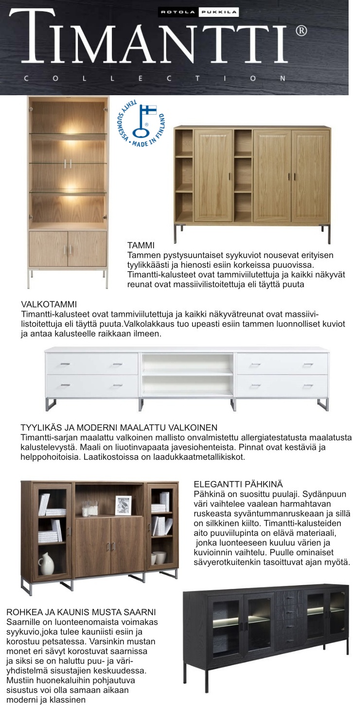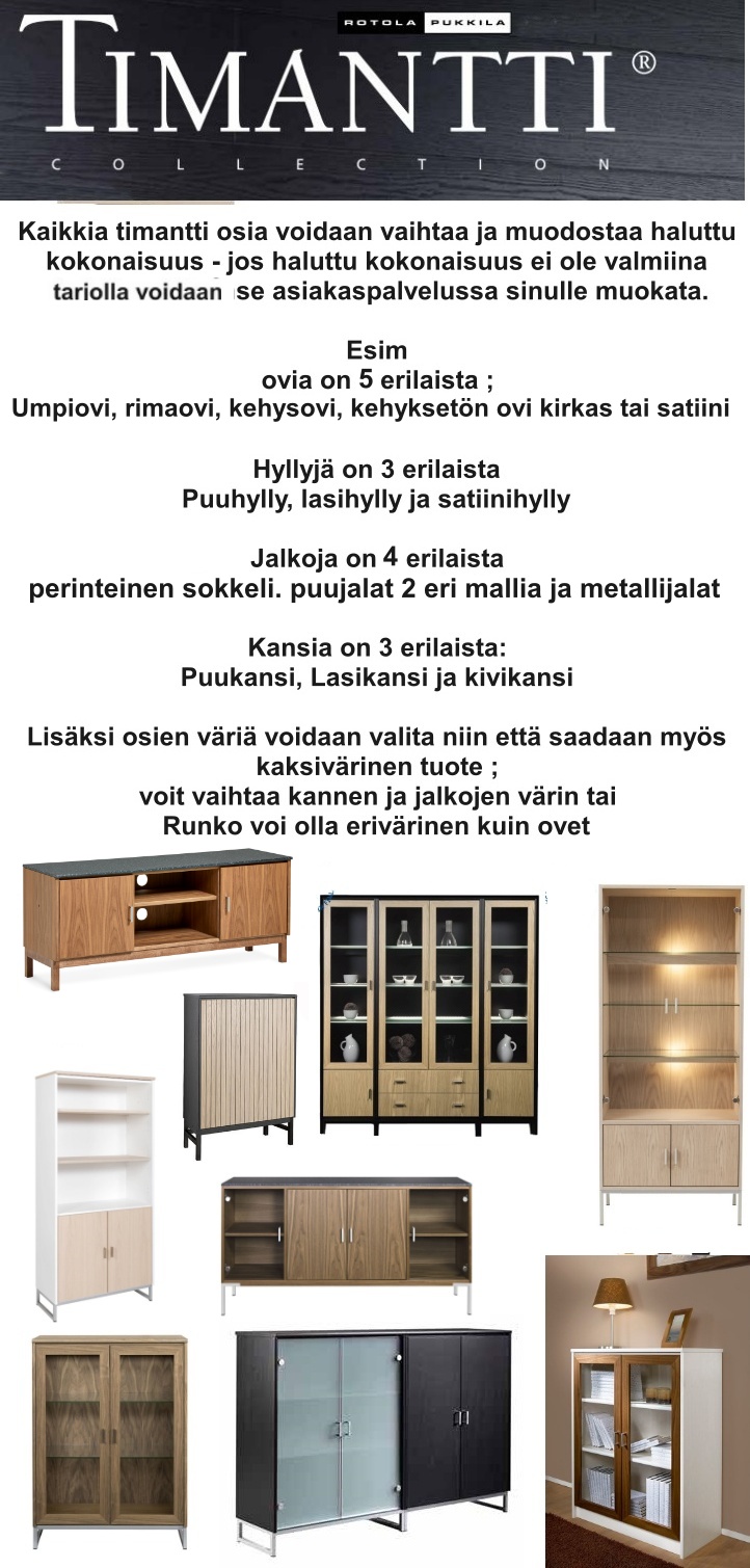 Timantti-malliston avulla voit luoda täysin omanlaisesi kokonaisuuden yhdistelemällä moduuleja ja puulajeja ovien, lisäkansien ja laatikoiden osalta. Hyllyt, vetimet ja ovet on helppo kiinnittää, ja moduulit voidaan asentaa kumpaankin suuntaan tai kiinnittää toisiinsa ruuveilla tiiviiksi kokonaisuudeksi. Saatavilla on myös lasi- ja puuhyllyt, joista lasihyllyjen maksimikuormitus on 10 kg, sekä lisävarusteita kuten metallikehikko tai puujalat sokkelin sijaan. Tai voit suunnitella oman kokonaisuuden timantti suunnitteluohjelmalmalla