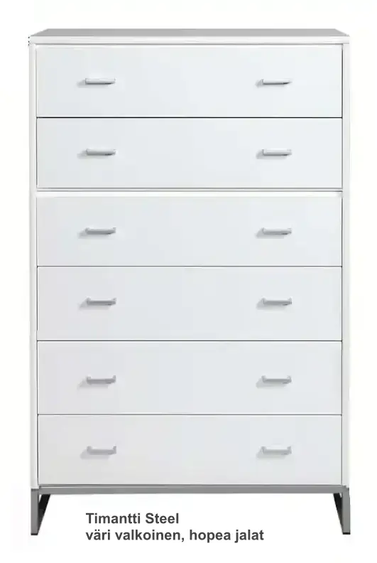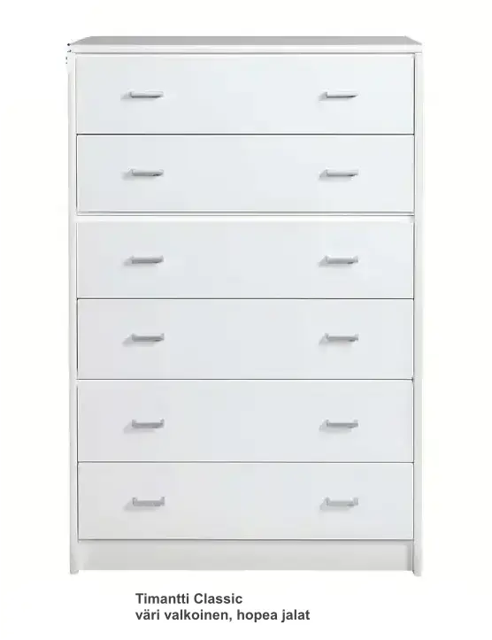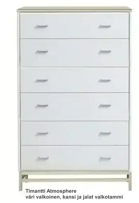 Kuusi laadukasta laatikkoa metallikiskoilla tarjoavat sujuvan, hiljaisen käytön ja runsaasti säilytystilaa niin makuuhuoneeseen, olohuoneeseen kuin eteiseenkin. Timantti Air -jalat voidaan valita lipaston värisiksi tai erillisiksi kontrastisävyiksi, ja vetimistä on tarjolla kolme tyylikästä vaihtoehtoa — Vakio M3, Ferro musta tai Ferro harmaa.