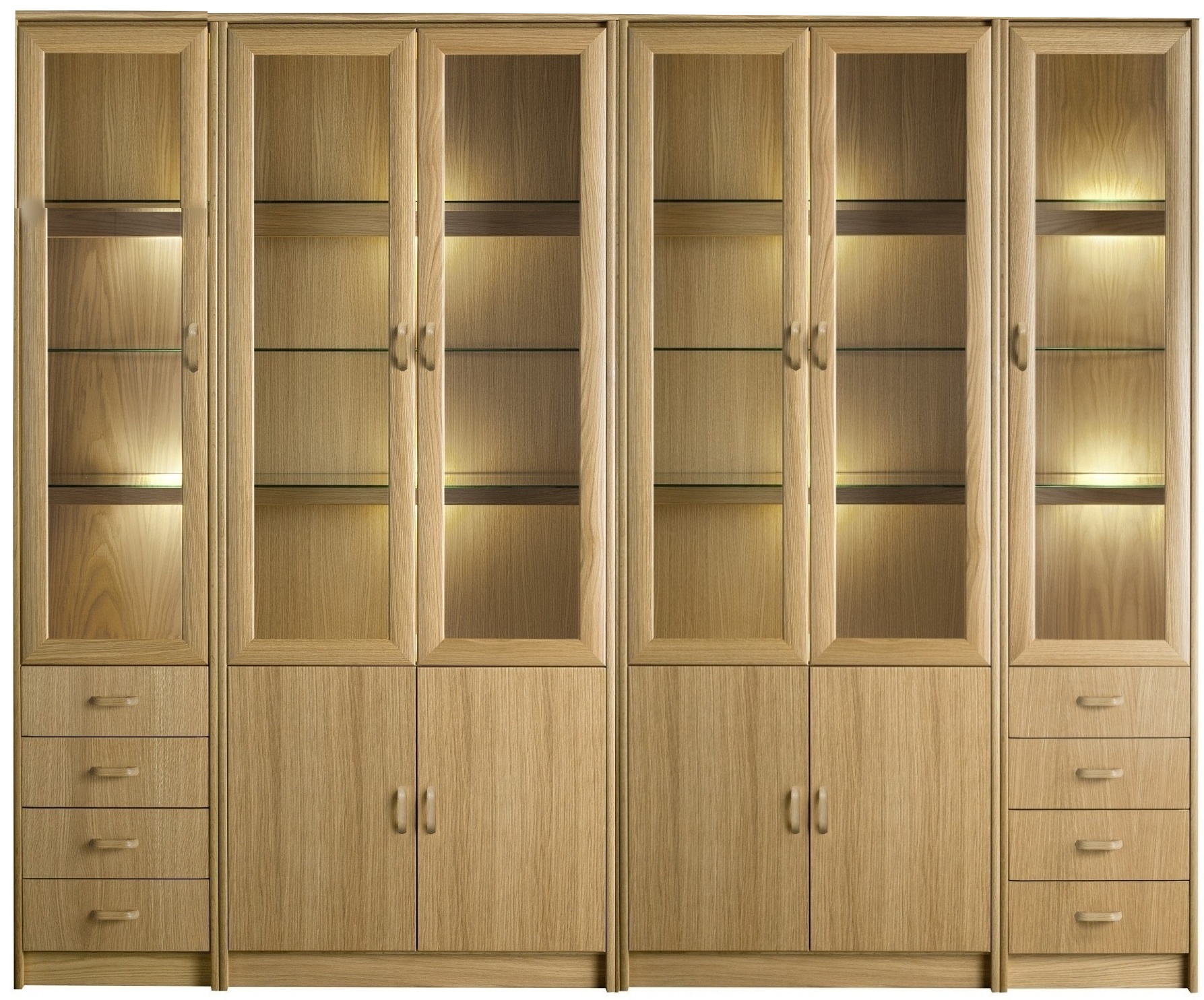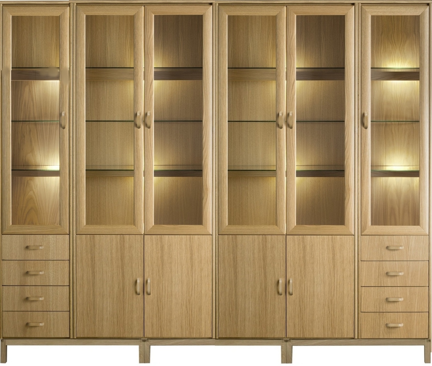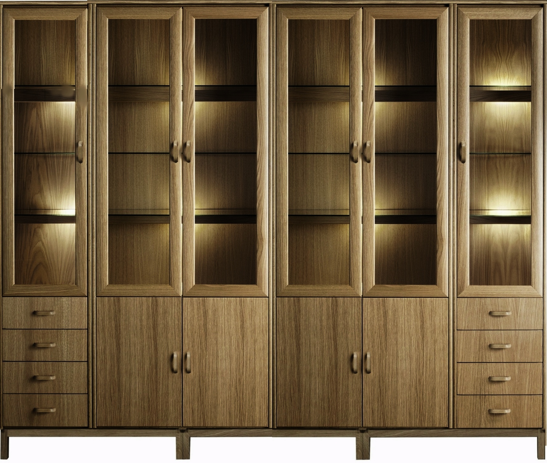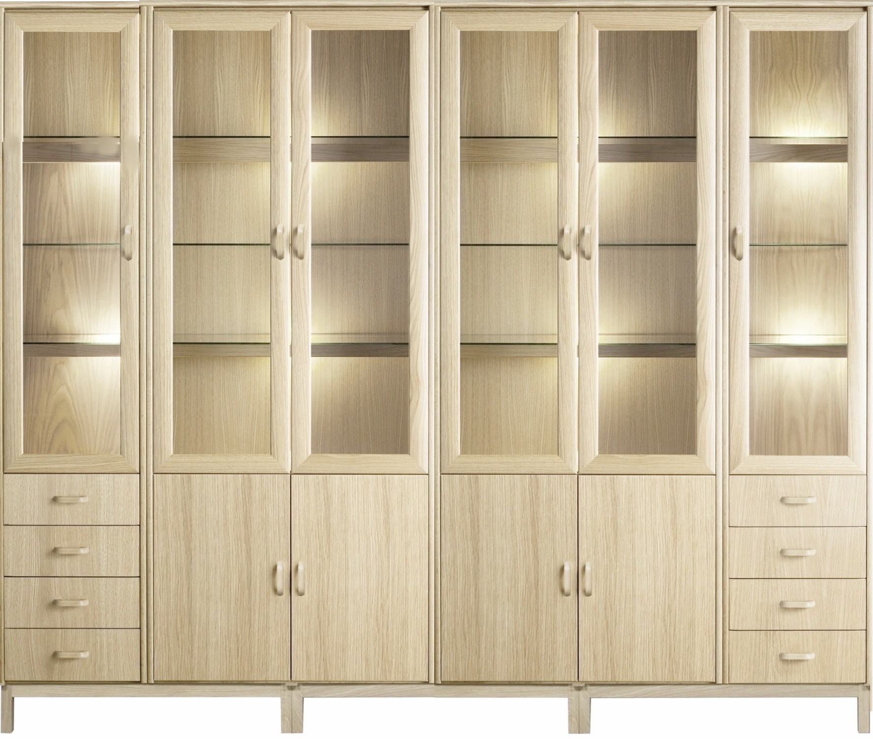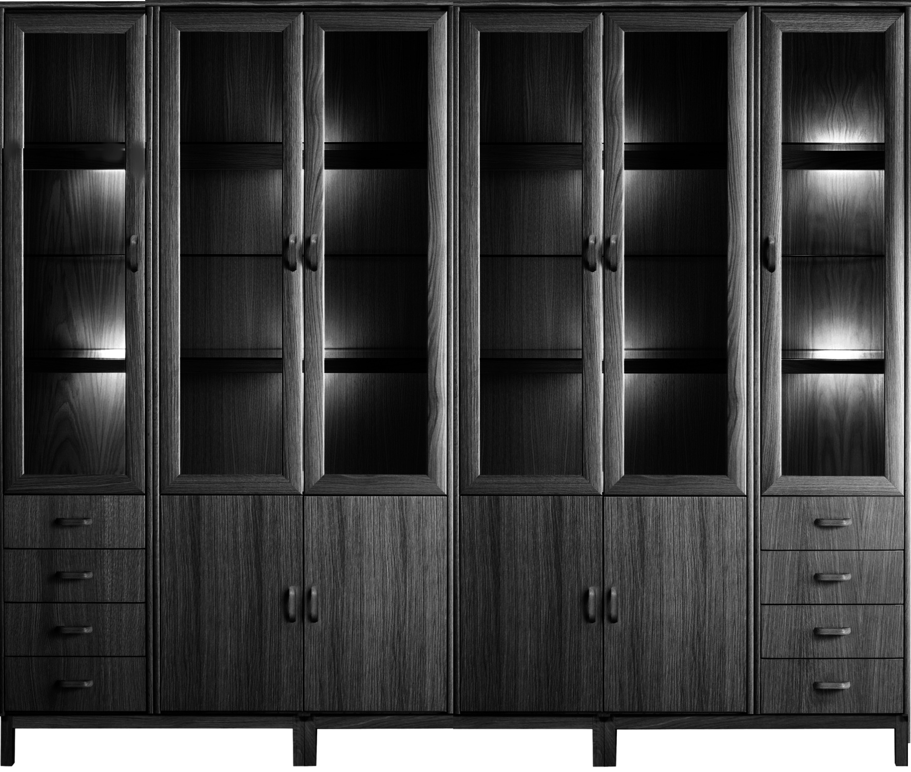 Hyllyssä on 2 leveää ja korkeaa kaappia alla umpiovilla ja ylhäällälasikehysovilla. REunoissa kapeat hyllyt alla 4 laatikolla ja yllä lasiovella. Vitriinin hyllyt saatavava joko lasisena tai puisina. Kokonaisuus on suunniteltu helposti räätälöitäväksi; voit valita vitriinin yhdellä värillä tai yhdistellä rungon, kannen ja oven eri sävyissä sekä halutessasi vaihtaa oven mallin sisustusta korostavaksi vaihtoehdoksi. Lisävarusteena tilattavissa hyllyjen taakse ledvalot joko tehdasasennettuna tai itseasennettavana himmentimellä tai ilman. Näin kaluste mukautuu elämäntilanteen ja tarpeiden muuttuessa.