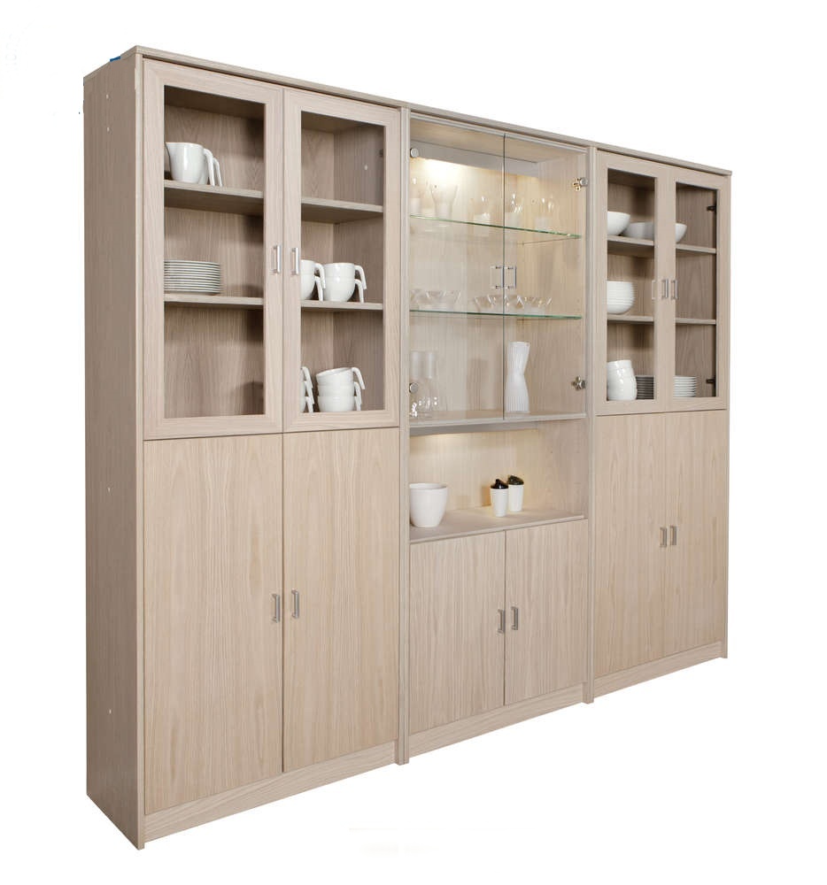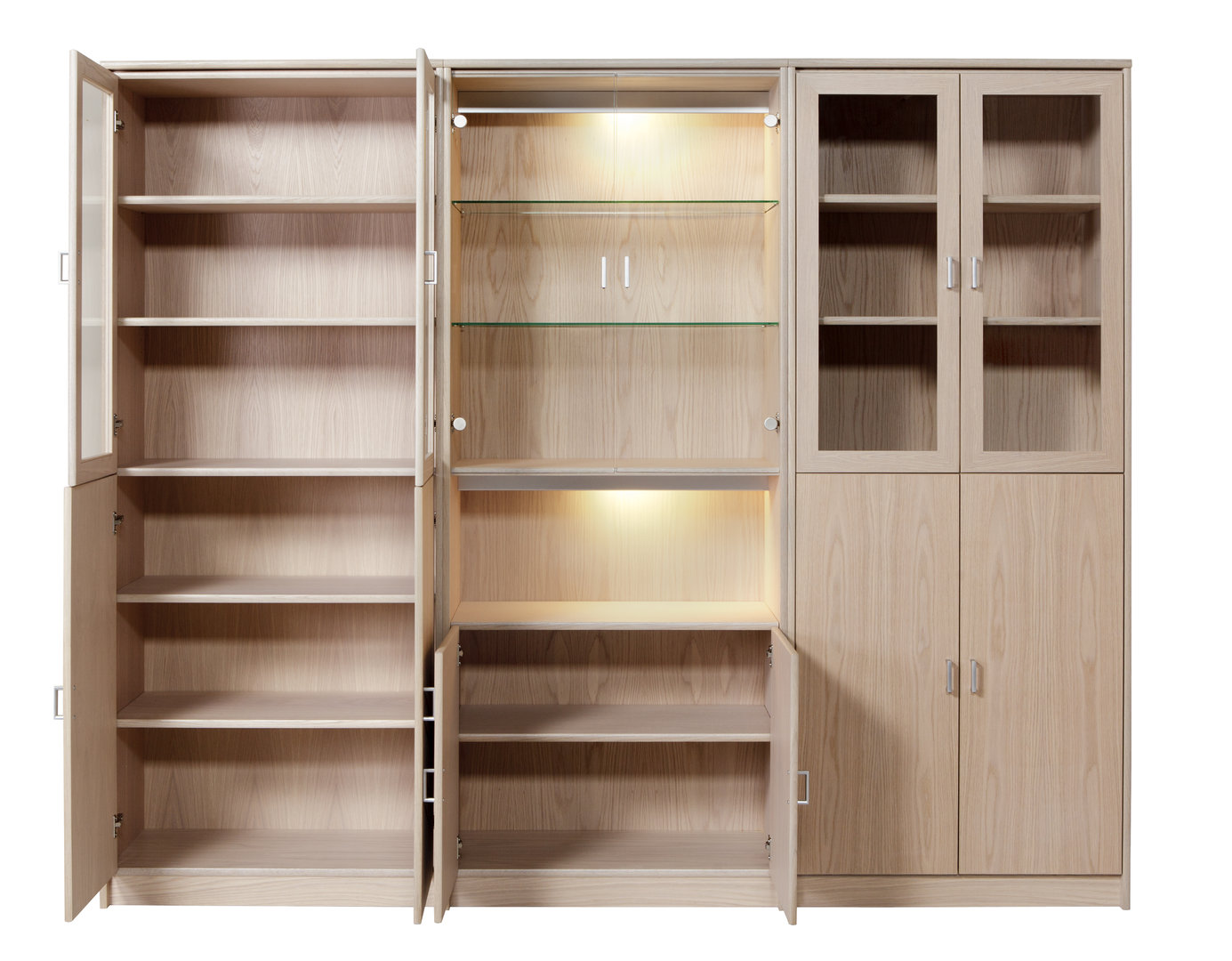 Hyllyssä on kolme leveää hyllyä jossa keskellä kirkkaat lasiovet alla avohylly ja matalat umpiovet ja reunoissa korkeat umpiovet ja päällä kehykselliset lasiovet ja ja voit valita hyllyille oman järjestyksen yhdistettäessä mouulit mikä tarjoaa tasapainon säilytyksen ja esillepanon välillä. Lisäksi voit valita hyllylle eri ovet, hyllymateriaalit sekä lisävarusteet, kuten kivi- tai lasikannet ja puu- tai metallijalat, antavat mahdollisuuden räätälöidä kokonaisuus juuri omaan kotiin sopivaksi.