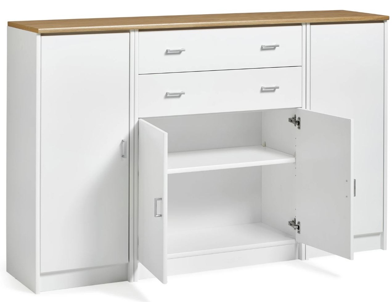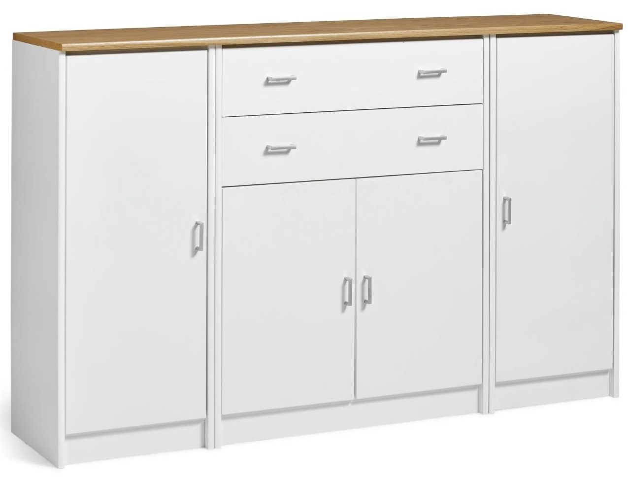 Senkissä on keskellä kaappi umpiovilla ja kaapin päällä 2 laatikkoa ja reunoilla 2 kaappia umpiovilla. Voit koota myös kokonaisuuden siten että sivulla on lasiovet ja keskelle jää umpiovet. Kokonaisuus on suunniteltu helposti räätälöitäväksi; voit valita senkin yhdellä värillä tai yhdistellä rungon, kannen ja oven eri sävyissä sekä halutessasi vaihtaa oven mallin sisustusta korostavaksi vaihtoehdoksi. Näin kaluste mukautuu elämäntilanteen ja tarpeiden muuttuessa.