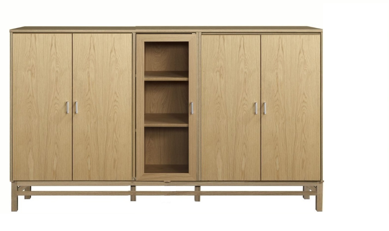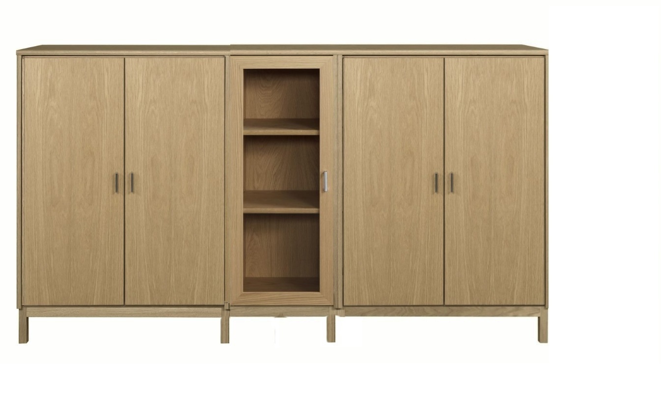 Senkissä on 3 kaappia josta reunalla 2 leveää kaappia ja keskellä kapea kaappi lasikehysovella ja reunoilla olevat kaapit ovat saatavana puuhyllyllyillä ja umpiovilla. Kokonaisuus on suunniteltu helposti räätälöitäväksi; voit valita senkin yhdellä värillä tai yhdistellä rungon, kannen ja oven eri sävyissä sekä halutessasi vaihtaa oven mallin sisustusta korostavaksi vaihtoehdoksi. Näin kaluste mukautuu elämäntilanteen ja tarpeiden muuttuessa.
