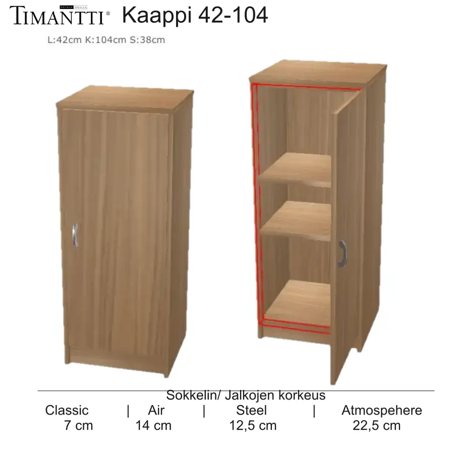 | 42 cm | 39 cm | 72 cm | cm | cm | cm | cm | cm | cm | cm | 12.5 cm | cm | cm | cm | cm | cm | cm | cm | cm | cm | cm | cm | cm | cm | cm | cm | cm | cm | cm | Takuu 5 vuotta | Tilaustuote | Elementit valmiiksi kasattu, Toimitus runko koottuna vain jalat/sokkeli ja kansi kiinnitetään | kg | Musta, Pähkinä, Tammi, Valkotammi, Valkoinen maalattu | Sokkeli, Atmosphere puujalka 47042-2, Steel metallijalka 7042-hopea, Steel metallijalka 447042-musta | Puukansi 320 KA1/2 • 42 cm | 112 A1/2M, 7112 A1/2M | umpiovi • 215 UOK1/2 | Pinta aitoa puuviilua, valkoisessa allergiatestattu kalustelevy jossa maali on vesiohenteinen ja liuotinvapaa, Näkyvät reunat massiivilistoitettuja eli täyttä puuta, Metallijalat terästä, Vetimet metallia, Ovissa soft close mekanismi | Puuhylly | Vakio M3, Ferro Musta, Ferro Harmaa | Suomi | cm | cm | cm |
