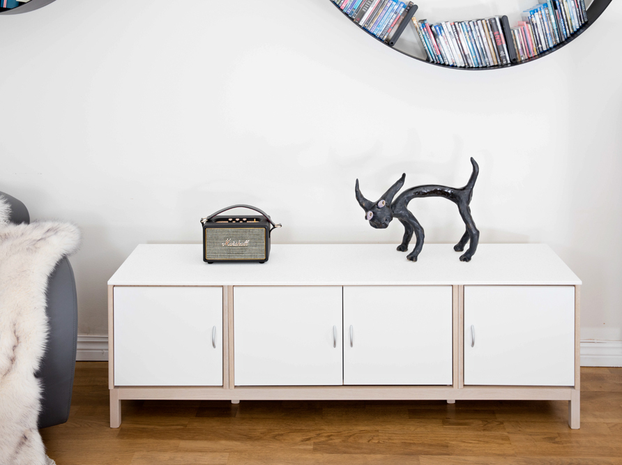 Tasossa on 3 kaappia reunoilla kapeat kaapit ja keskellä leveä kaappi. Kokonaisuus on suunniteltu helposti räätälöitäväksi; voit valita senkin yhdellä värillä tai yhdistellä rungon, kannen ja oven eri sävyissä sekä halutessasi vaihtaa oven mallin sisustusta korostavaksi vaihtoehdoksi. Näin kaluste mukautuu elämäntilanteen ja tarpeiden muuttuessa.