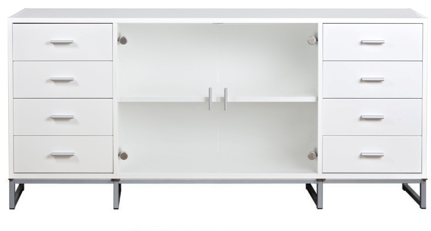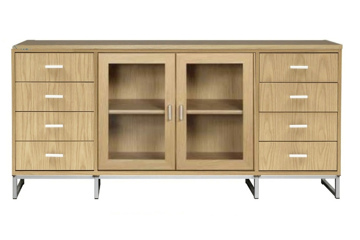 Tasossa on kaappi keskellä lasikehysovin ja reunoilla laatikostot. Kokonaisuus on suunniteltu helposti räätälöitäväksi; voit valita senkin yhdellä värillä tai yhdistellä rungon, kannen ja oven eri sävyissä sekä halutessasi vaihtaa oven mallin sisustusta korostavaksi vaihtoehdoksi. Näin kaluste mukautuu elämäntilanteen ja tarpeiden muuttuessa.