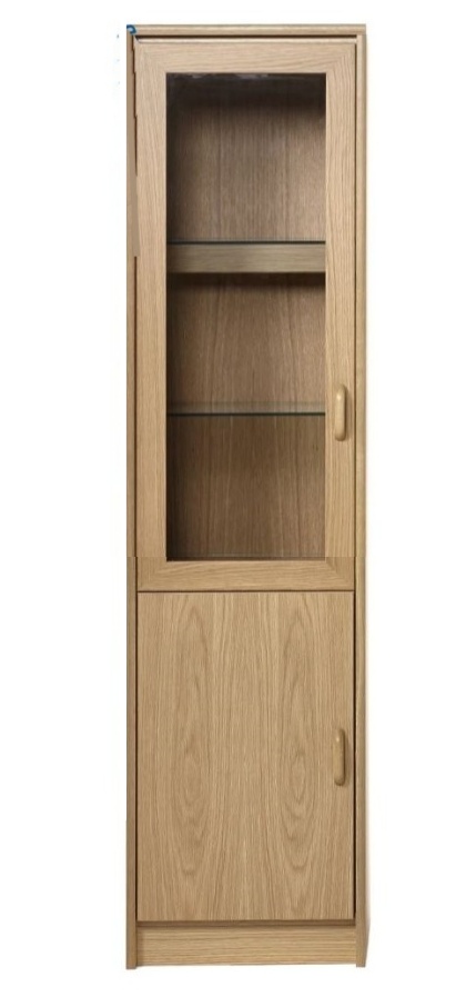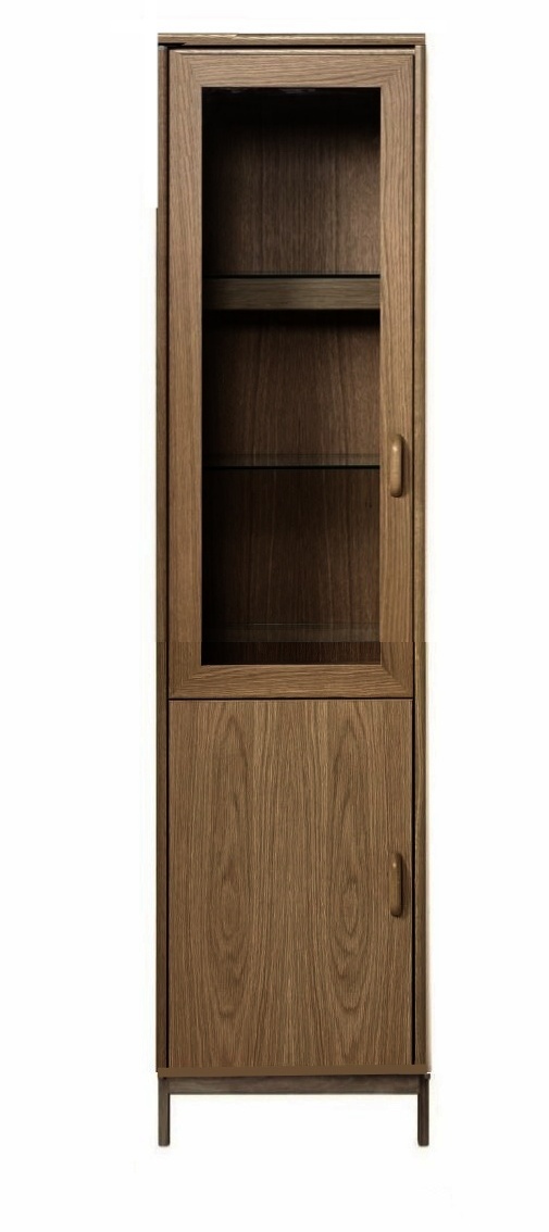 Vitriinissä on alla käytännöllinen laatikosta ja päällä vitriinikaappi hyllyllä ja lasikehysovet. Kokonaisuus on suunniteltu helposti räätälöitäväksi; voit valita vitriinin yhdellä värillä tai yhdistellä rungon, kannen ja oven eri sävyissä sekä halutessasi vaihtaa oven mallin sisustusta korostavaksi vaihtoehdoksi. Näin kaluste mukautuu elämäntilanteen ja tarpeiden muuttuessa.