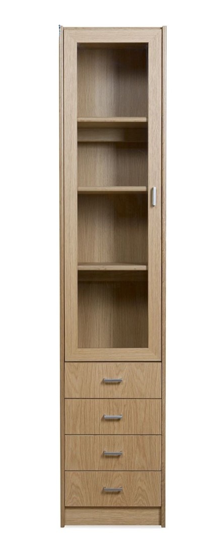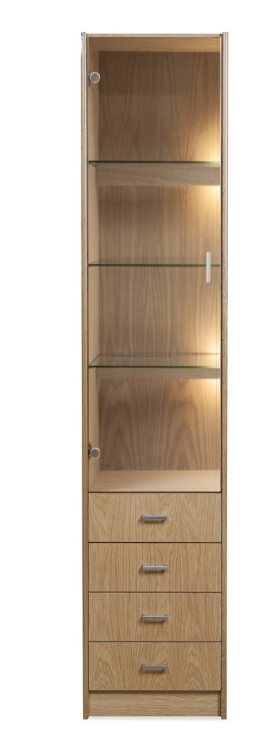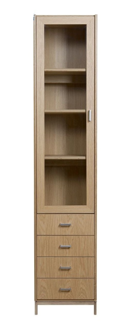 Vitriinissä on alla käytännöllinen laatikosta ja päällä vitriinikaappi hyllyllä ja lasikehysovet. Kokonaisuus on suunniteltu helposti räätälöitäväksi; voit valita vitriinin yhdellä värillä tai yhdistellä rungon, kannen ja oven eri sävyissä sekä halutessasi vaihtaa oven mallin sisustusta korostavaksi vaihtoehdoksi. Näin kaluste mukautuu elämäntilanteen ja tarpeiden muuttuessa.
