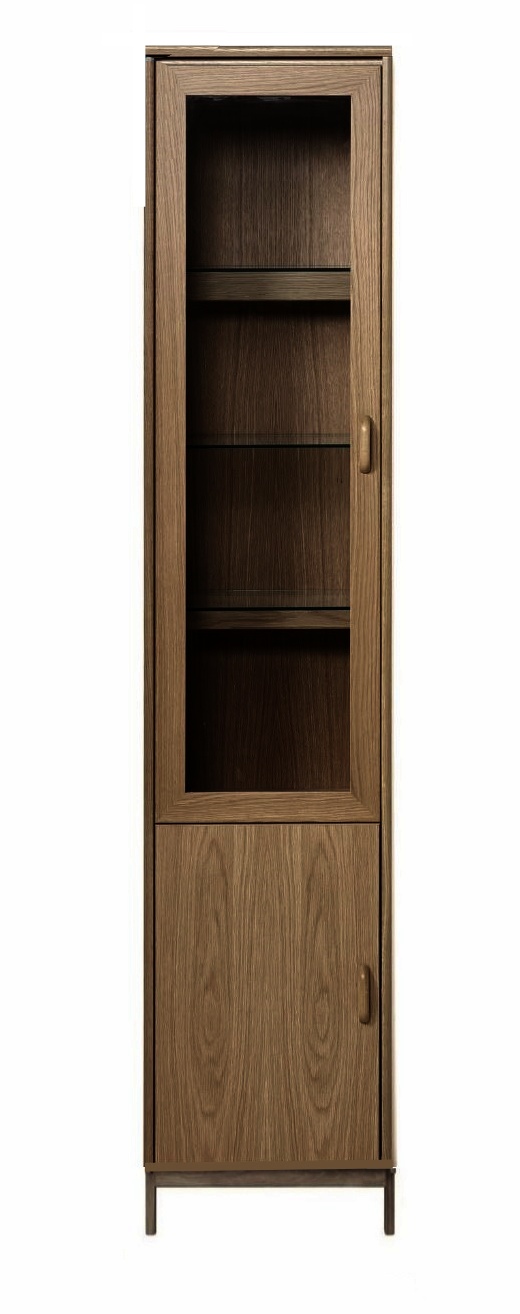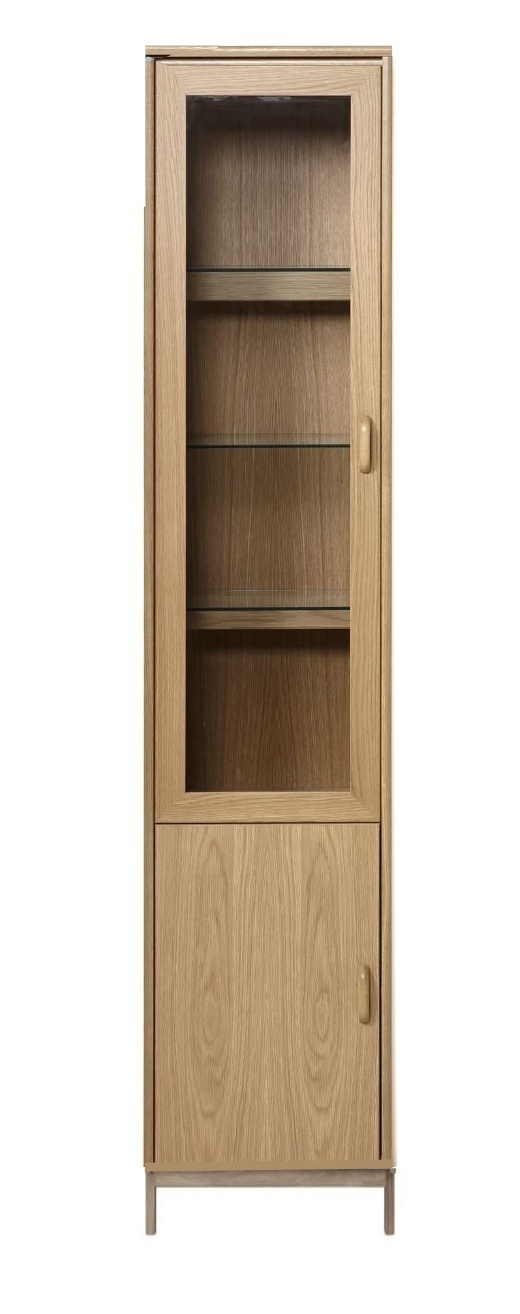 Vitriinissä on alla käytännöllinen kaappi umpiovella ja päällä vitriinikaappi hyllyllä ja lasikehysovet. Kokonaisuus on suunniteltu helposti räätälöitäväksi; voit valita vitriinin yhdellä värillä tai yhdistellä rungon, kannen ja oven eri sävyissä sekä halutessasi vaihtaa oven mallin sisustusta korostavaksi vaihtoehdoksi. Näin kaluste mukautuu elämäntilanteen ja tarpeiden muuttuessa.