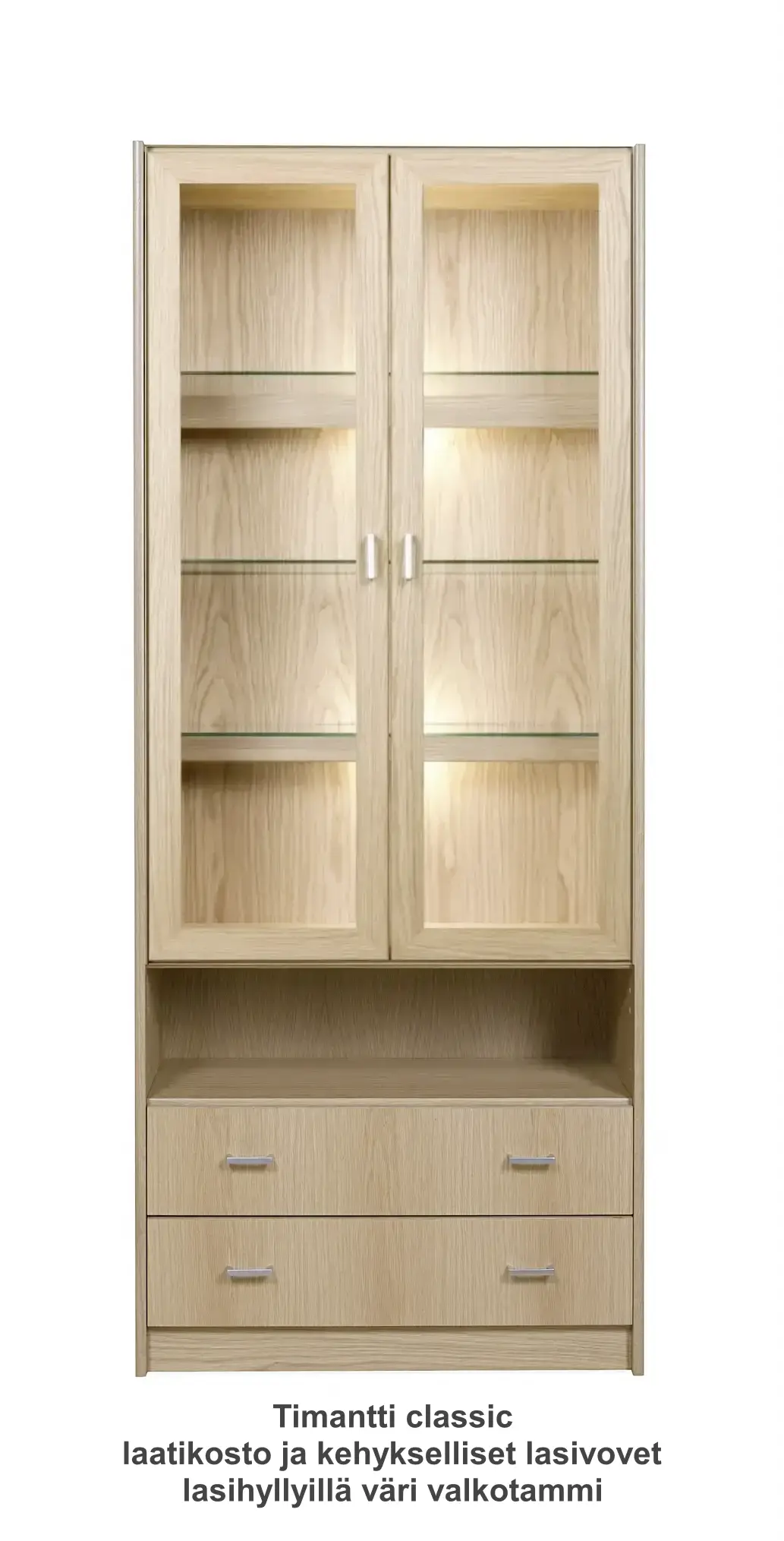 Vitriinissä on alla käytännöllinen laatikosto 2 laatikolla ja päällä vitriini kolmella lasihyllyllä. Vitriinin 2 lasihyllyn takana on led kynttilälamput ja valolista ja vitriinissä on lasikehysovet. Kokonaisuus on suunniteltu helposti räätälöitäväksi; voit valita vitriinin yhdellä värillä tai yhdistellä rungon, kannen ja oven eri sävyissä sekä halutessasi vaihtaa oven mallin sisustusta korostavaksi vaihtoehdoksi. Näin kaluste mukautuu elämäntilanteen ja tarpeiden muuttuessa.