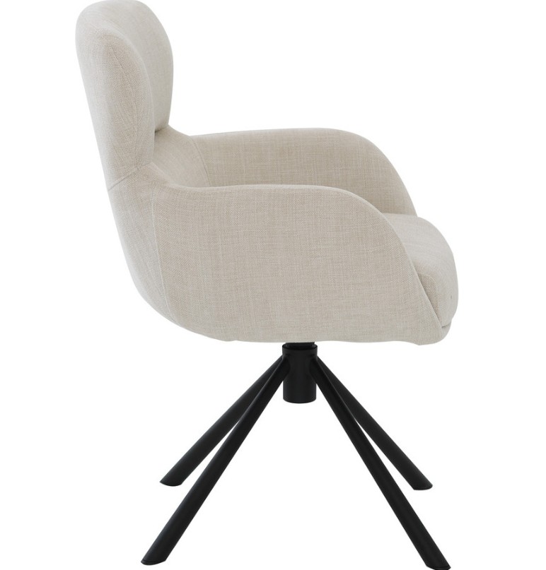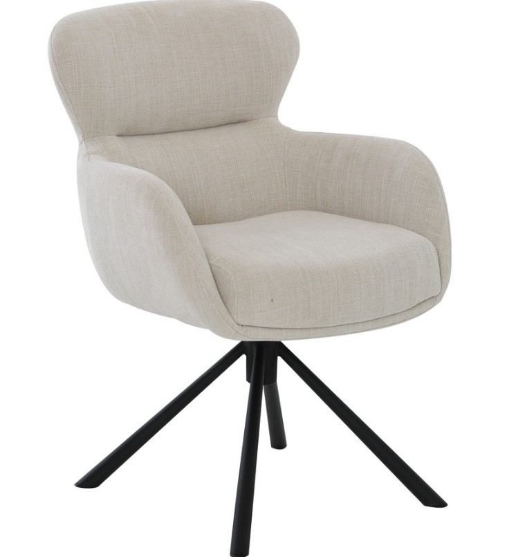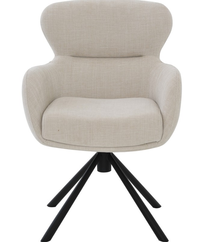 Tinde-tuoli yhdistää tyylikkään designin ja erinomaisen istumamukavuuden ainutlaatuisella tavalla. Pehmeästi muotoiltu, beige kangasverhoilu ja tukeva vaahtomuovipehmuste tarjoavat miellyttävän istuinkokemuksen, kun taas tuolin pyörivä ja keinuva mekanismi tekee siitä erityisen rennon ja monikäyttöisen. Musta metallinen ristikkojalka lisää ryhtiä ja modernia ilmettä, tuoden samalla vakautta ja kestävyyttä.