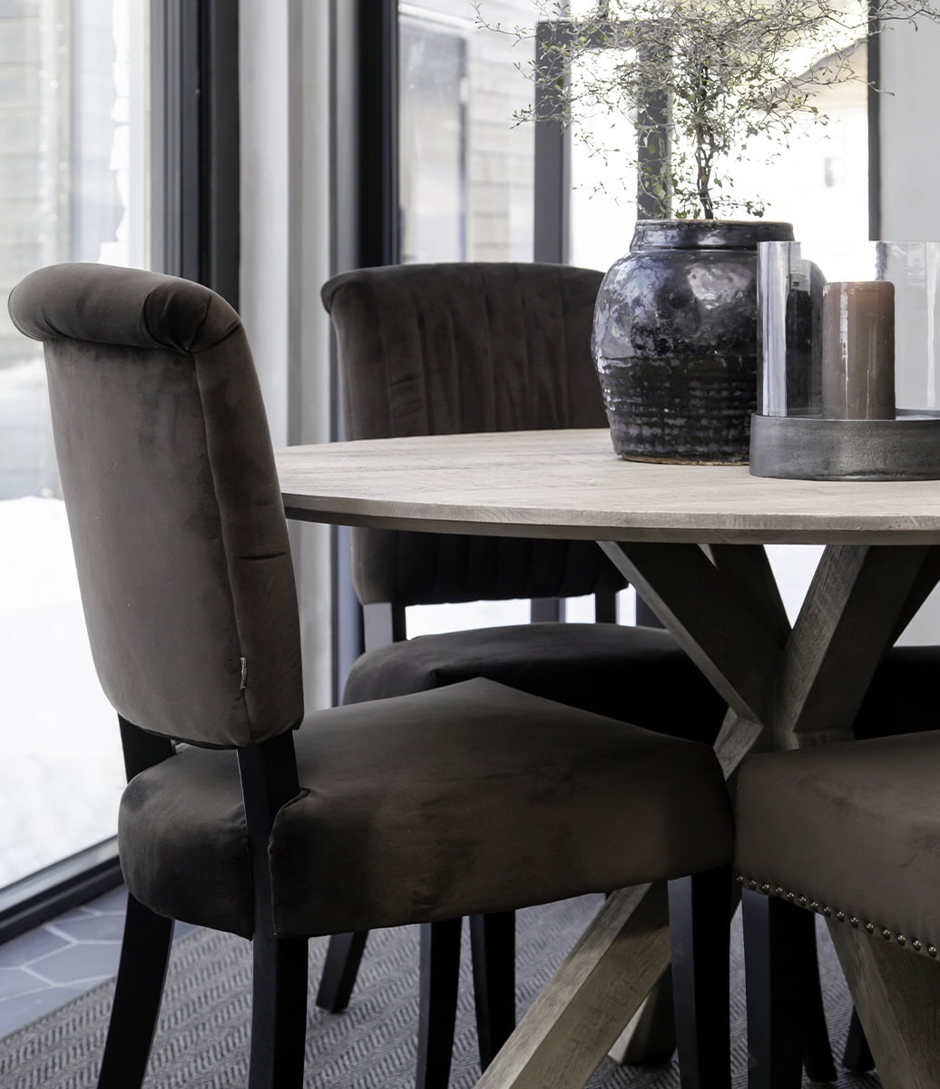 Tree pyöreä ruokapöytä yhdistää näyttävän modernin ristikkojalan ja kauniin massiivitammen, luoden tyylikkään ja ajattoman kokonaisuuden. Käsin käsitelty ja maalattu pinta korostaa tammen luonnollisia oksia ja halkeamia, tehden jokaisesta pöydästä uniikin taideteoksen.