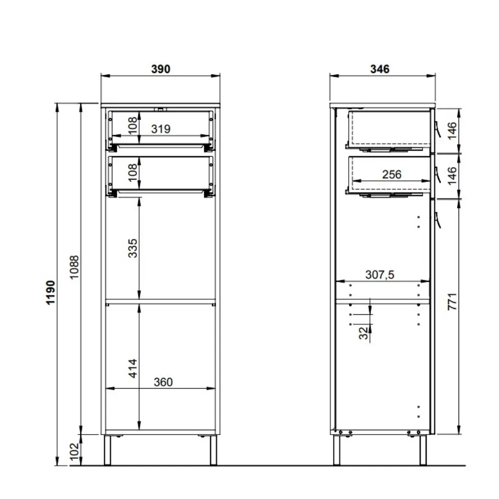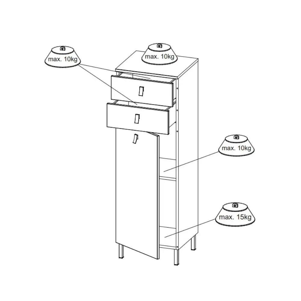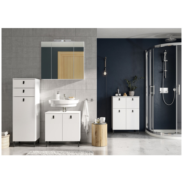 Kaksi vetolaatikkoa ja ovellinen kaappi, jonka sisällä on korkeussäädettävä hylly, tarjoavat runsaasti tilaa kylpyhuonetarvikkeille, pyyhkeille ja muille arjen esineille. Selkeä ja toimiva rakenne tekee tarvikkeiden järjestämisestä helppoa ja pitää kylpyhuoneen siistinä.