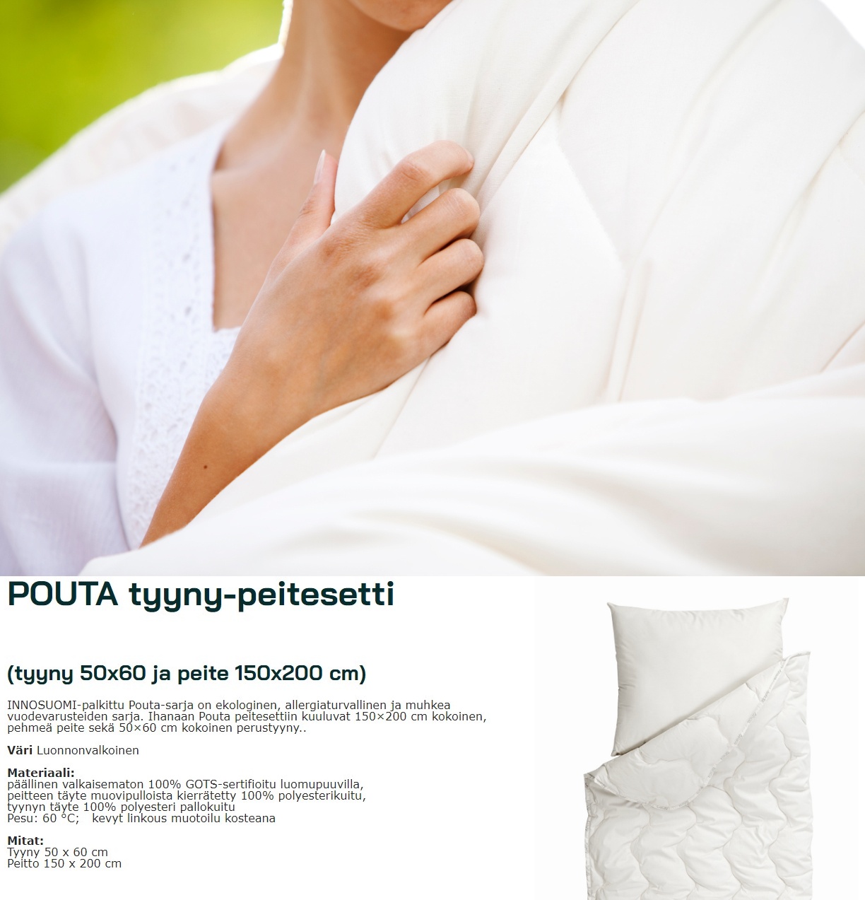 Kaikissa seteissä on hengittävät, korkealaatuiset materiaalit ja ne on suunniteltu kestämään pesua 60 °C:ssa säilyttäen samalla pehmeytensä ja muotonsa. Sekä peitto että tyyny on mitoitettu täydellisesti tarjoamaan mukavuutta ja tukea – peite 150×200 cm ja tyyny 50×60 cm – ja ne sopivat mainiosti ympärivuotiseen käyttöön. Pouta-sarjan ekologisuus ja Uniluoto-setin helppohoitoisuus takaavat, että löydät juuri sinulle sopivan vaihtoehdon.