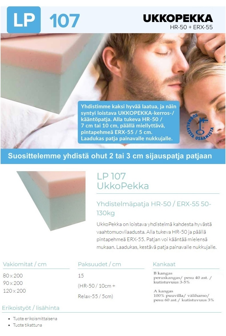 UkkoPekka-patja tarjoaa täydellisen yhdistelmän pintapehmeyttä ja tukea. Sen kaksikerroksinen rakenne – tukeva HR-50-vaahtomuovi alla ja myötäilevä ERX-55 päällä – mukautuu kehoon juuri oikealla tavalla. Tämä tekee siitä erinomaisen valinnan painavammille nukkujille, jotka arvostavat ylellistä, pitkäikäistä ja ergonomista nukkumismukavuutta.