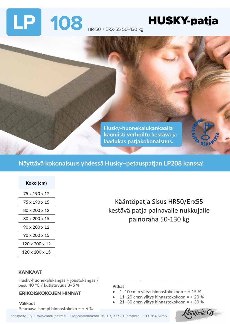 Verhoiluna on irrotettava ja pestävä patjakangas, joka säilyttää raikkauden ja kestää käyttöä. Tai sitten voit tilata patjan verhoiltuna Ruskealla Hysky huonekalukankaalla. Saatavana useissa mitoissa, myös erikoiskokoisena, ja kahdessa paksuudessa – 10 cm ja 15 cm. Voit valita patjan joko sijauspatjalla tai ilman – juuri sinun unitarpeisiisi sopivana.