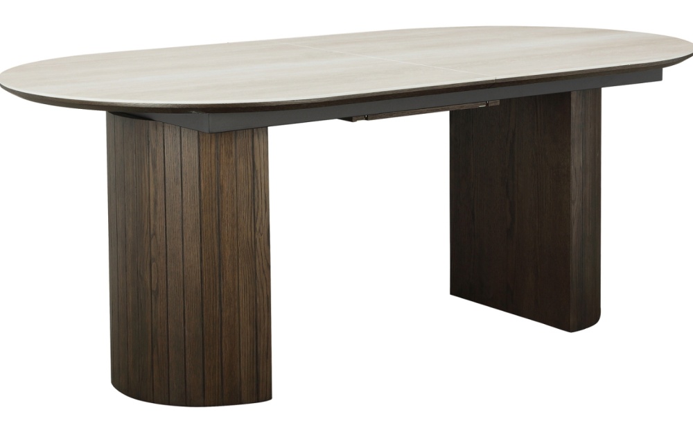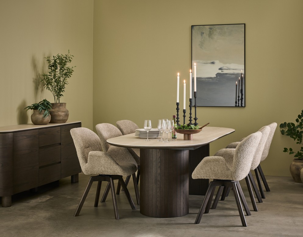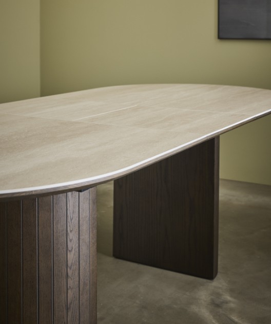 Ullern sarjan jatkettava ruokapöytä on tyylikäs ja näyttävä kaluste, joka yhdistää ylellisen muotoilun ja arjen käytännöllisyyden saumattomasti. Pöydän kaunis beige travertiinia ja keramiikkaa yhdistävä kansi hehkuu luonnollista eleganssia, ja sen lämpimän ruskea tammiviiluinen runko luo kokonaisuuteen harmonisen ja arvokkaan ilmeen. Pehmeät pyöristetyt muodot ja tukevat tolppamaiset jalat tekevät pöydästä sarjan muiden tuotteiden tavoin modernin, kutsuvan ja rakenteeltaan erittäin vakaan.