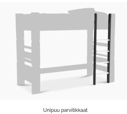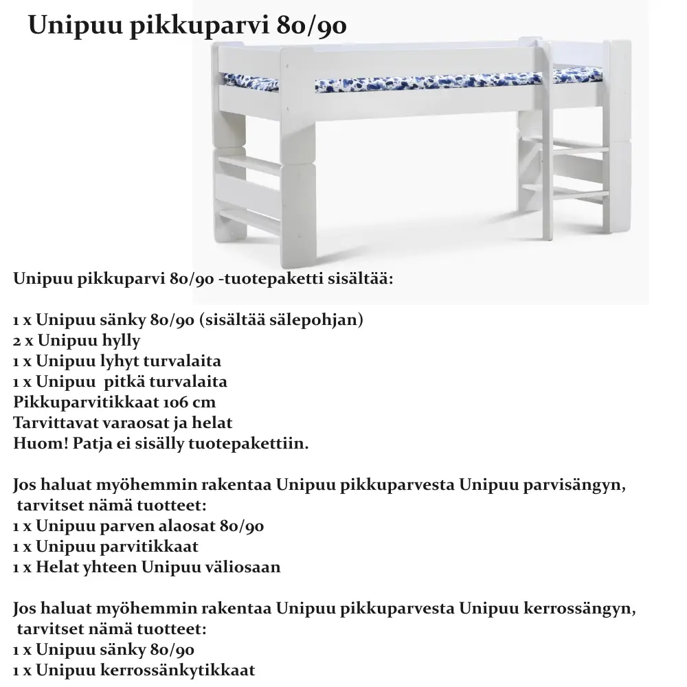 joita tarvitset kun haluat korottaa Unipuu sängyn parveksi tai pikkuparveksi. Niemen Tehtaiden Unipuu sarja on tukeva sekä turvallinen ja se on suunniteltu erityisesti lapsille sekä nuorille. Tuotteet ovat tehty laadukkaista materiaaleista sekä suomalaiseen sisustukseen sopivaksi.