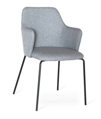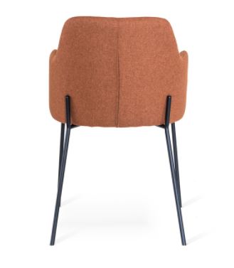 Tuoli on verhoiltu miellyttävällä kangasverhoilulla ja saatavana ruskeana tai harmaana, mikä mahdollistaa harmonisen yhdistämisen erilaisiin sisustustyyleihin. Mustat metallijalat tuovat kokonaisuuteen modernia kontrastia ja varmistavat tukevan ja kestävän rakenteen päivittäiseen käyttöön.
