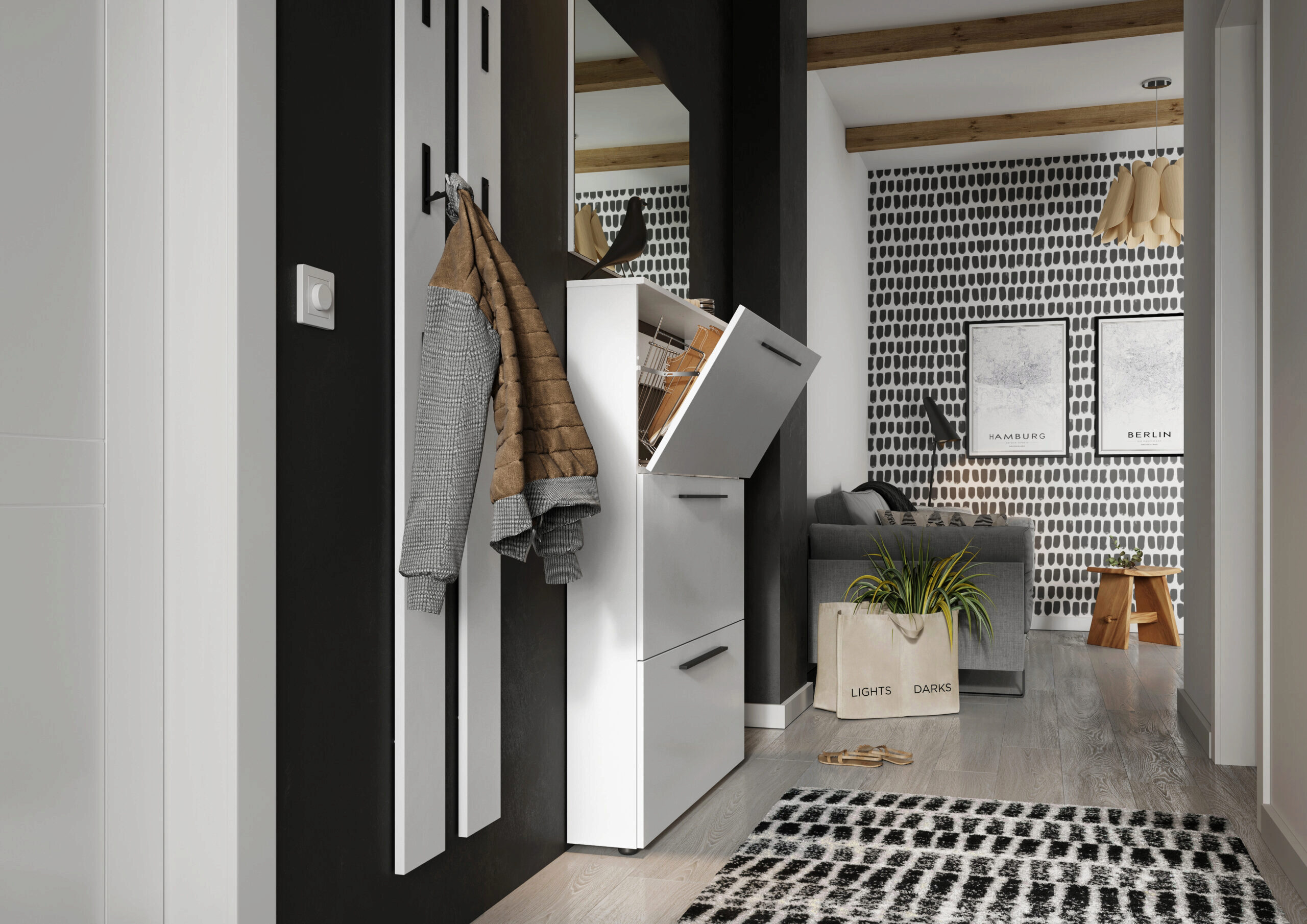 Utah kenkäkaappi 2577 tarjoaa kolme alaspäin avautuvaa klaffiovea, joihin mahtuu jopa 12 paria kenkiä siististi ja tehokkaasti. Selkeä ja moderni muotoilu pitää eteisen järjestyksessä ja tuo tilaan raikkaan, huolitellun ilmeen.
