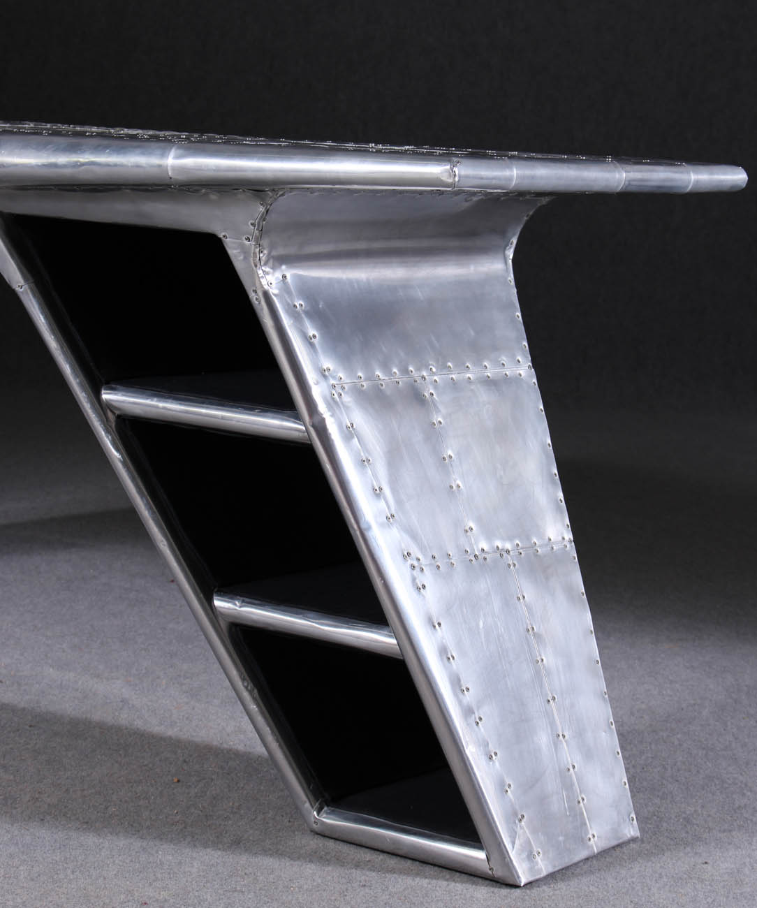 Pöydän tukeva puurunkoinen rakenne on viimeistelty näyttävällä alumiinipäällysteellä, joka tuo kokonaisuuteen ylellisyyttä ja kestävyyttä. Metallinen pinta korostaa tuotteen ainutlaatuista aviator-tyyliä ja säilyttää upean ilmeensä vuosienkin käytössä.