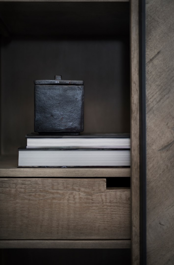 Kaappi on valmistettu jykevästä rustiikkitammesta ja kierrätetystä tammesta, jotka takaavat poikkeuksellisen kestävyyden ja tekevät siitä vastuullisen, ympäristöystävällisen valinnan. Materiaalien luonnollinen tekstuuri korostaa kaapin laadukasta ja pitkäikäistä rakennetta.