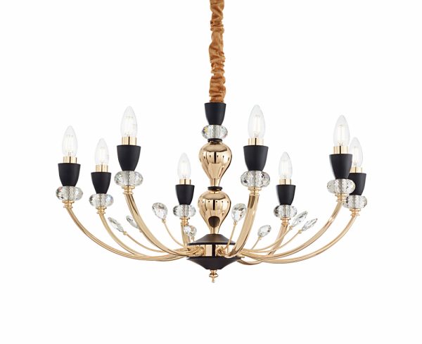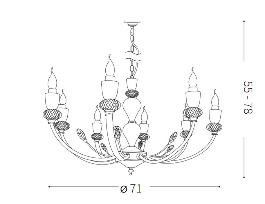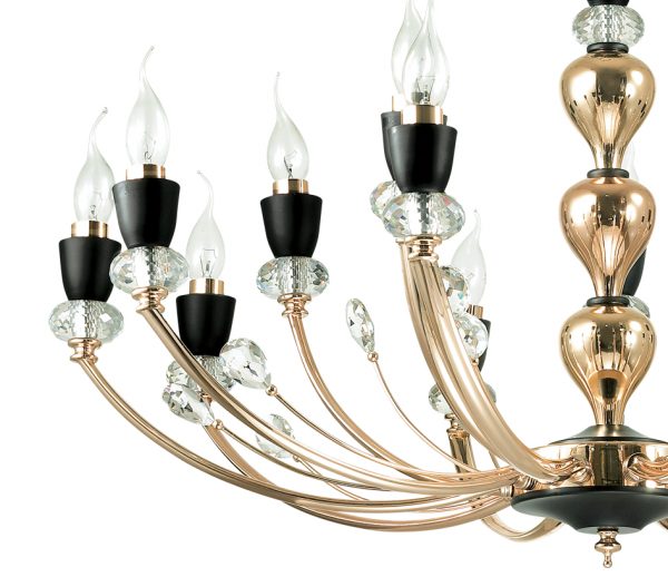 • Upea 8 tai 15- haarainen Vanity kruunuvalaisin kultaisella metallirungolla. Kaarevat haarat kristallisilla koriste-elementeillä. Samettinen ketjunsuojus. Design Italia.