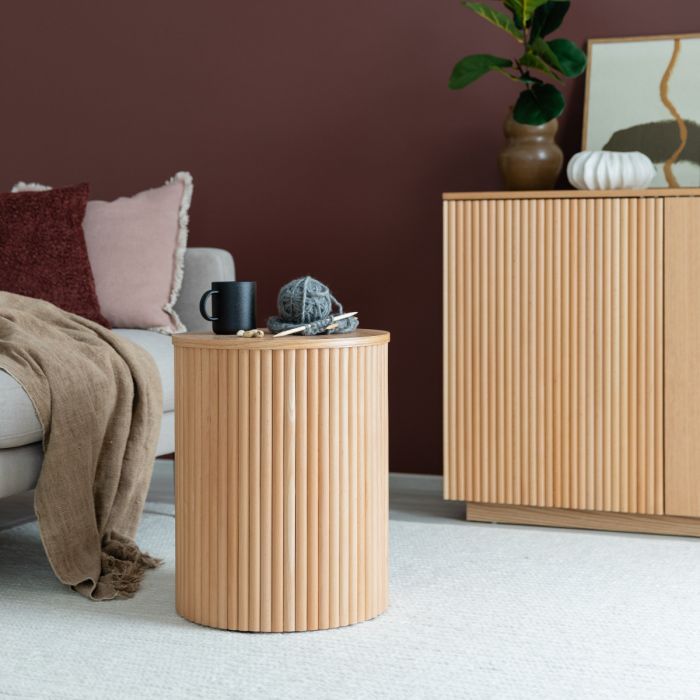 Halkaisijaltaan 40 cm ja korkeudeltaan 50 cm oleva pöytä sopii täydellisesti pienempiinkin tiloihin tuomatta liikaa visuaalista massaa. Sen ilmava muotoilu tekee siitä helpon yhdistää monenlaisiin sisustustyyleihin, ja luonnonvärinen pinta luo harmonisen tunnelman.