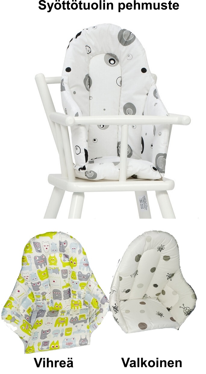 Syöttötuoli: valkoinen, koivu, pyökki, musta, pähkinä. Pehmuste Valkoinen/harmaa nro